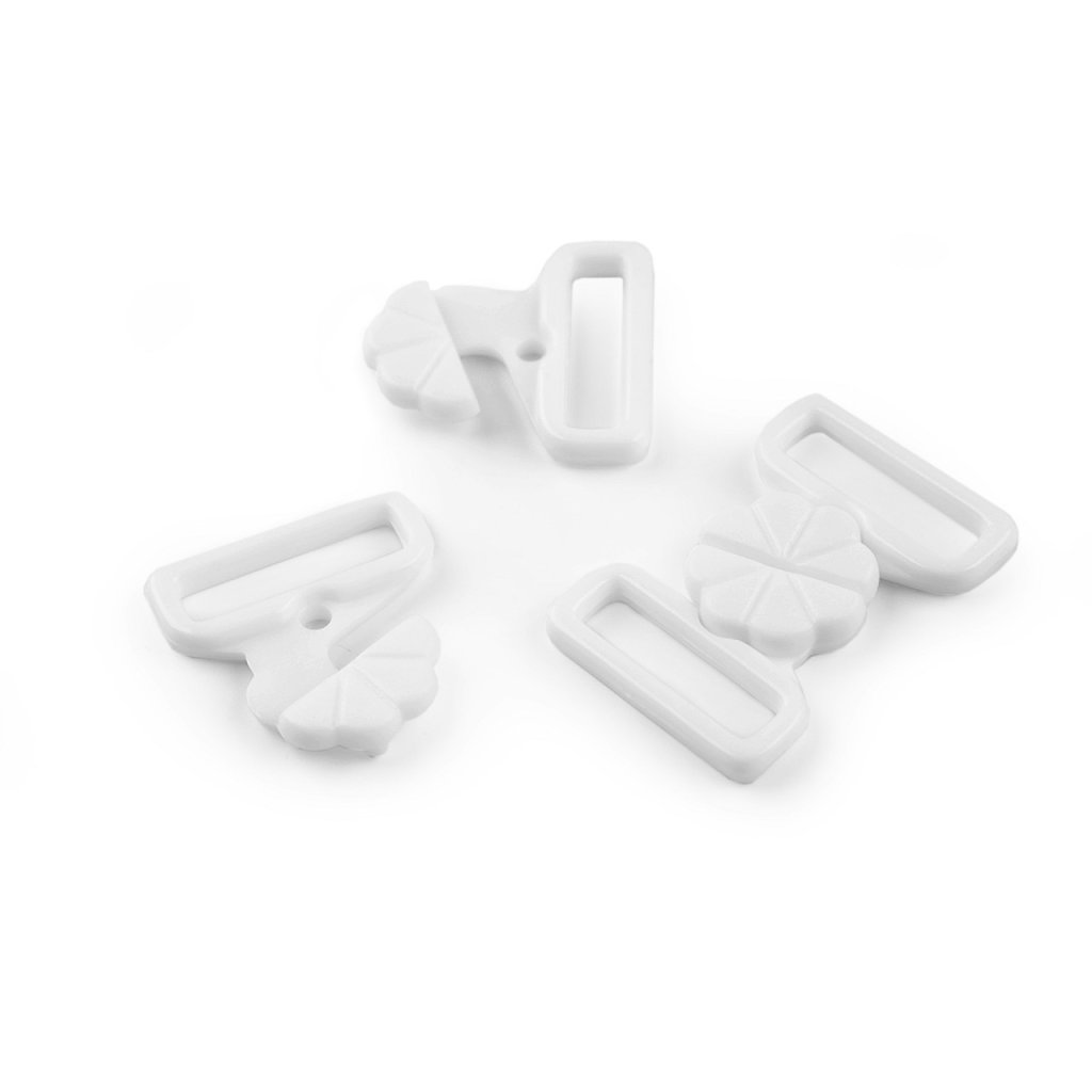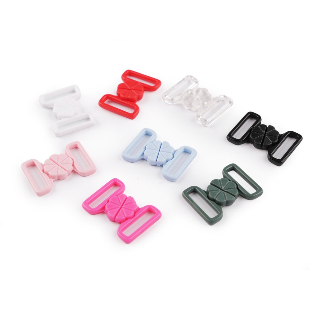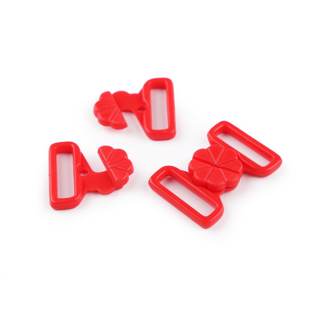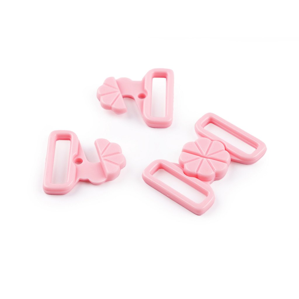 Plastové zapínání s designem květu využijete na plavky. Zapíná se vsunutím jednoho dílu mezi druhý díl a zacvaknutím. Rozměry jednoho dílu spony jsou 22 x 22 mm.