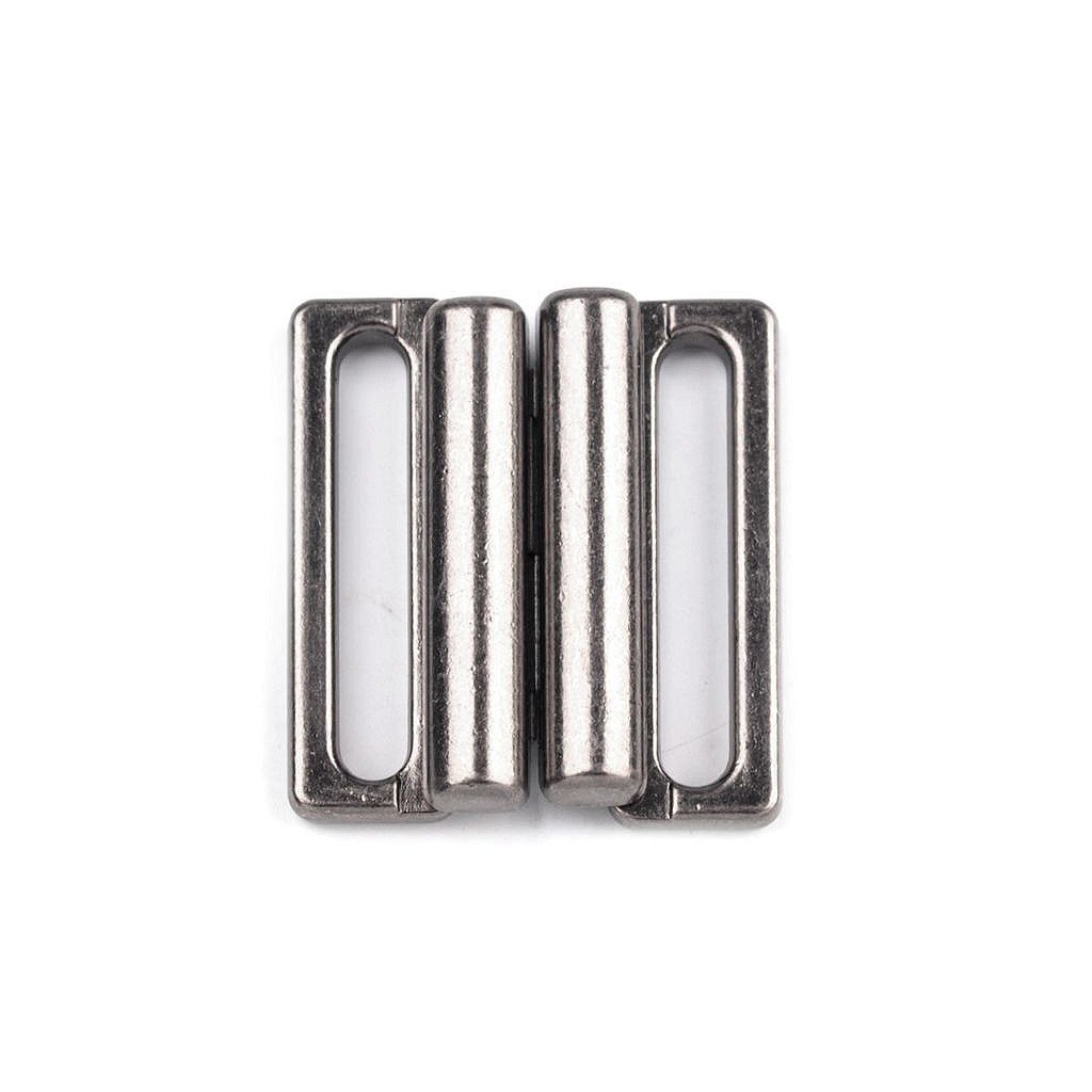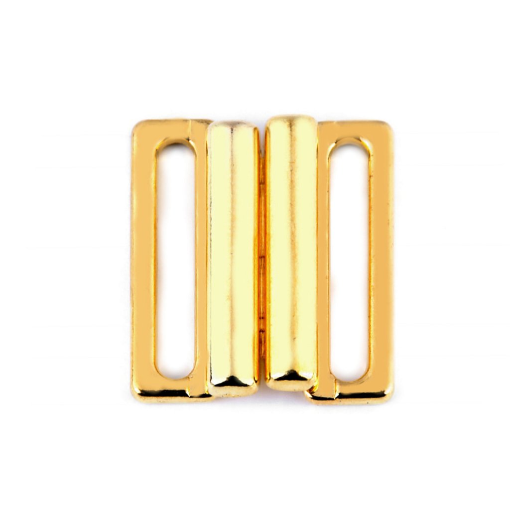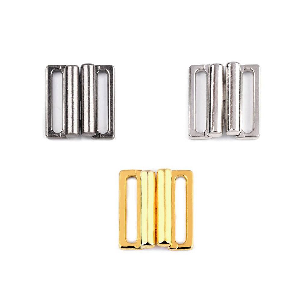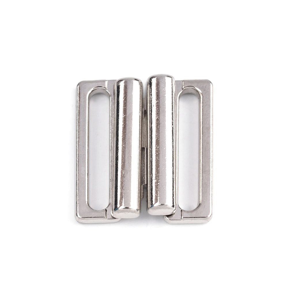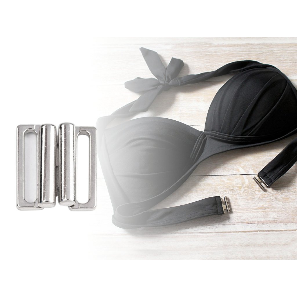 Kovové zapínání na plavky je složené ze dvou dílů a zapíná se vsunutím jednoho dílu mezi druhý díl. Rozměry jednoho dílu spony jsou 15 x 24 mm.