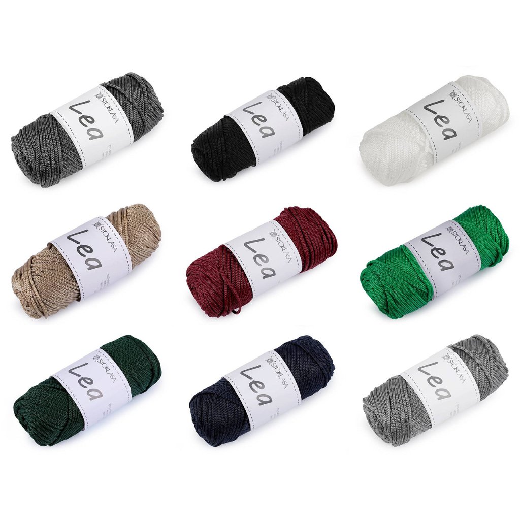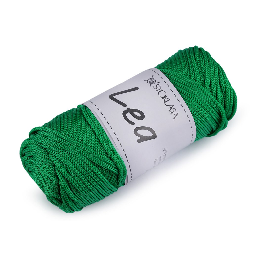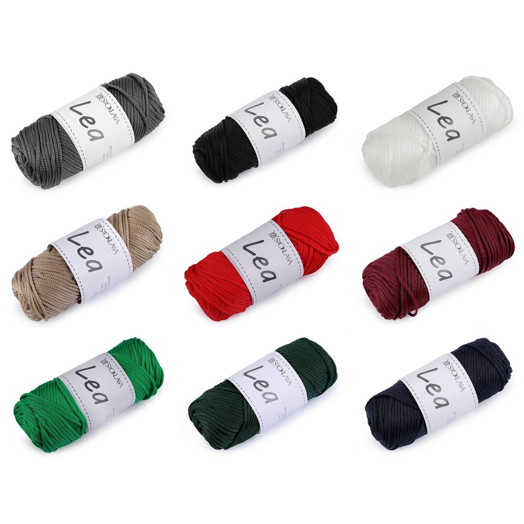 Pletací příze Lea připomíná provázek. Její povrch se jemně leskne. Hodí se na pletení a háčkování tašek, košíků a podobných výrobků.