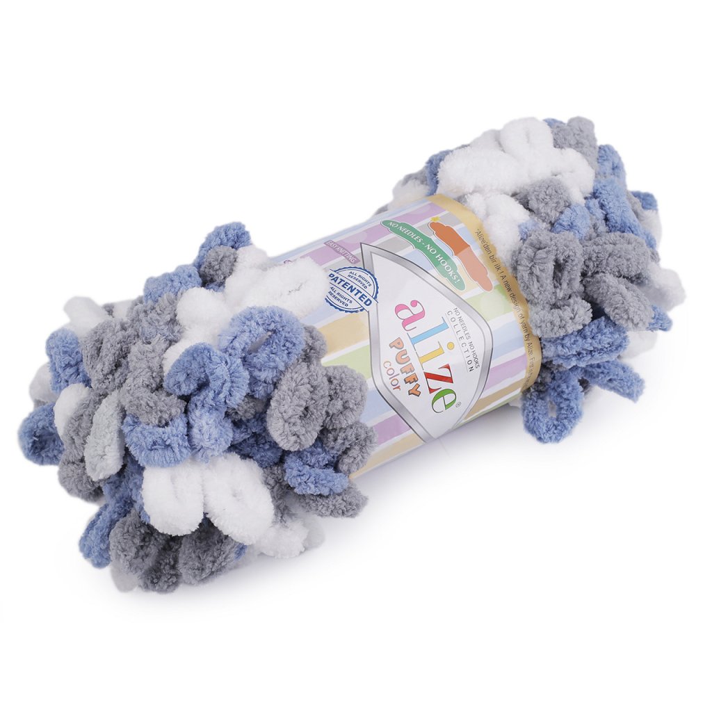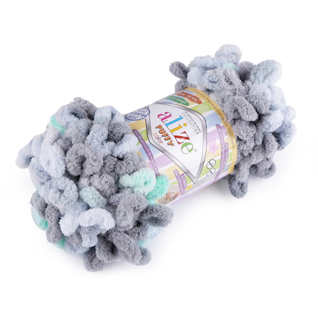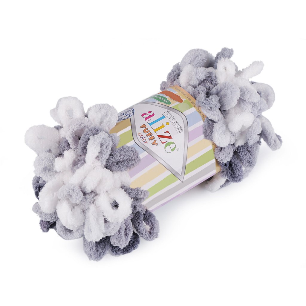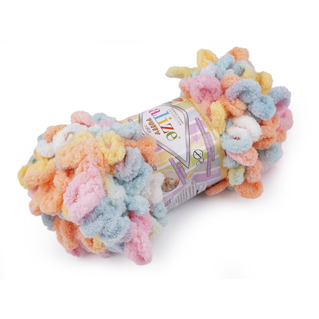 Příze Alize Puffy color je měkká, chlupatá žinylková příze s velkými očky. Tvoří nádherné barevné přechody. Na pletení nepotřebujete jehlice ani háček - proplétají se jednotlivá očka. Je vhodná na pletení dek, šálů apod.