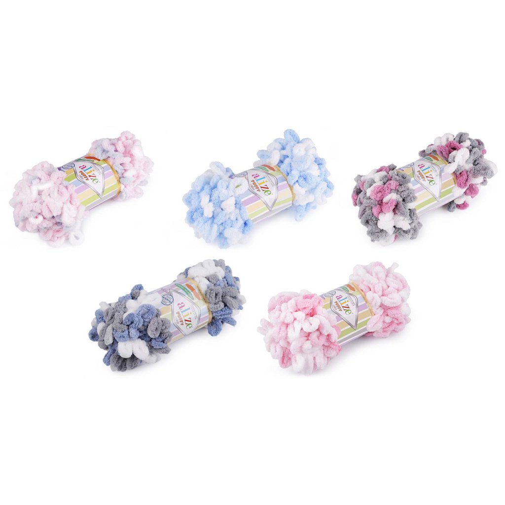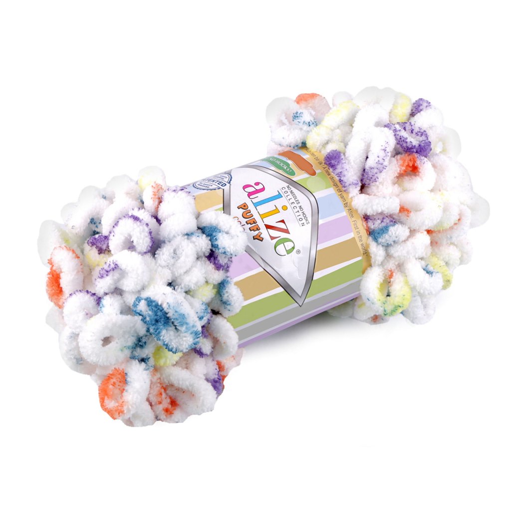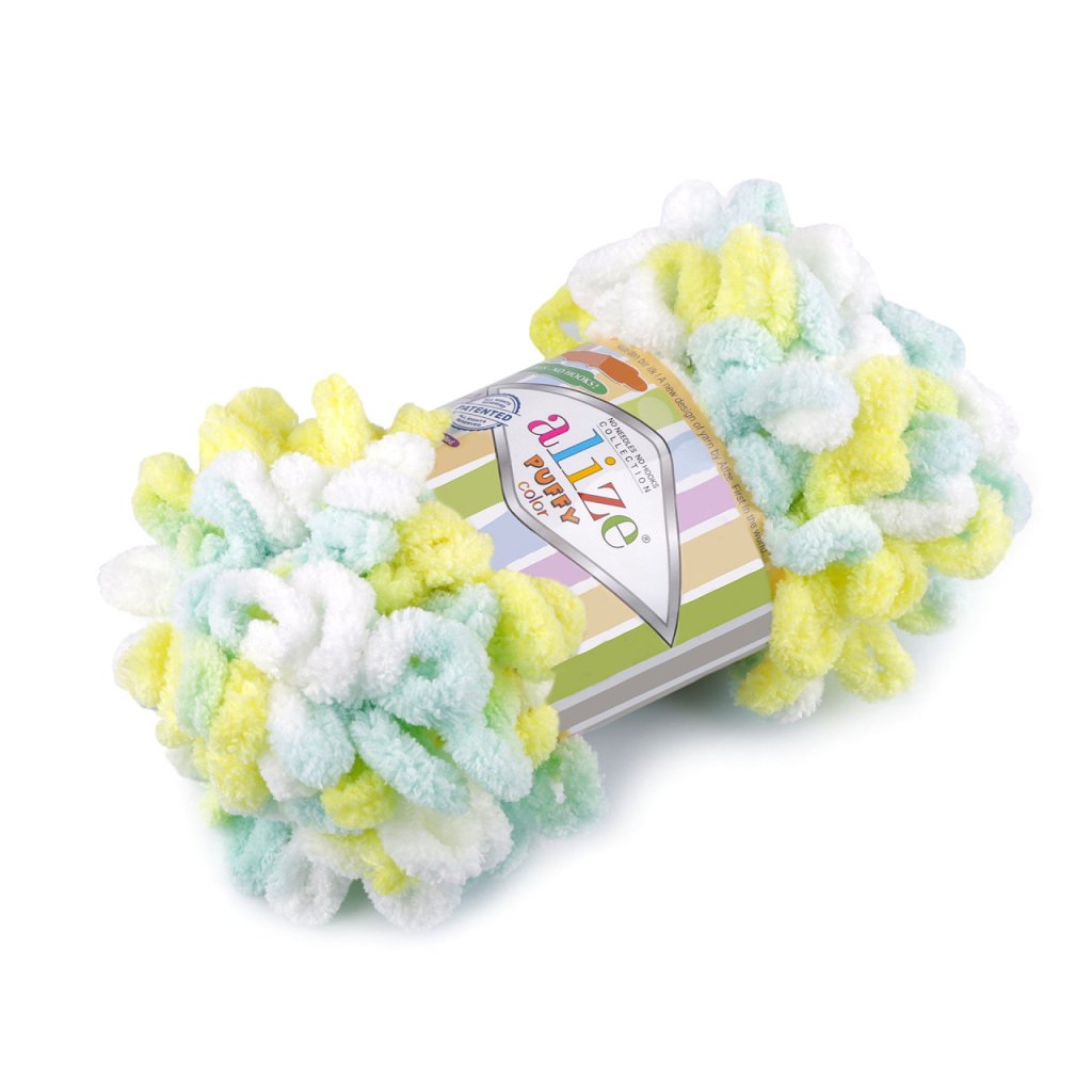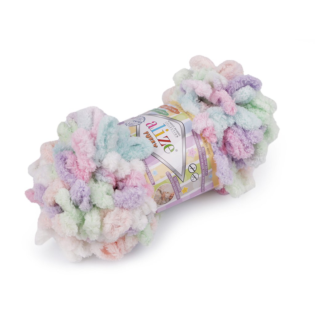 Příze Alize Puffy color je měkká, chlupatá žinylková příze s velkými očky. Tvoří nádherné barevné přechody. Na pletení nepotřebujete jehlice ani háček - proplétají se jednotlivá očka. Je vhodná na pletení dek, šálů apod.