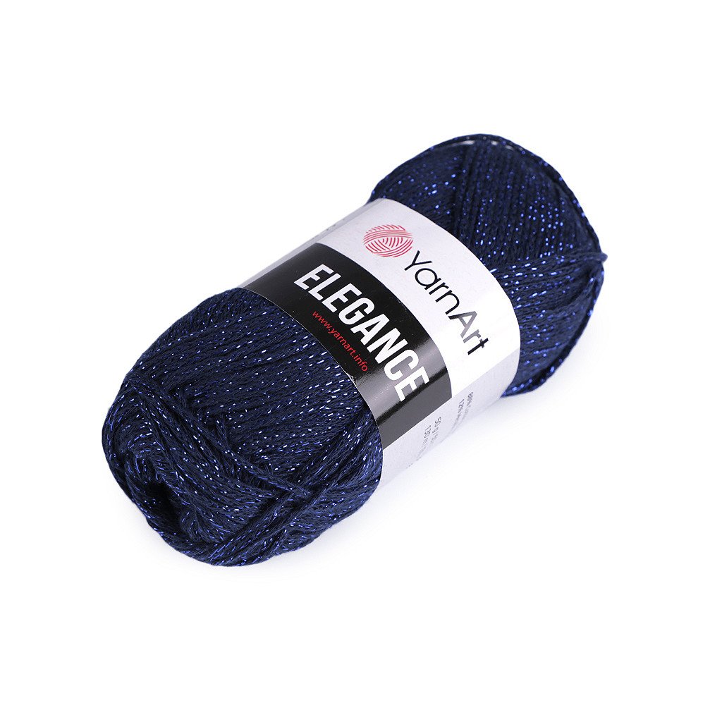 Pletací příze Elegance připomíná provázek. Je protkaná třpytivým lurexem. Můžete z ní uplést či uháčkovat svetříky, šály, čepice apod.