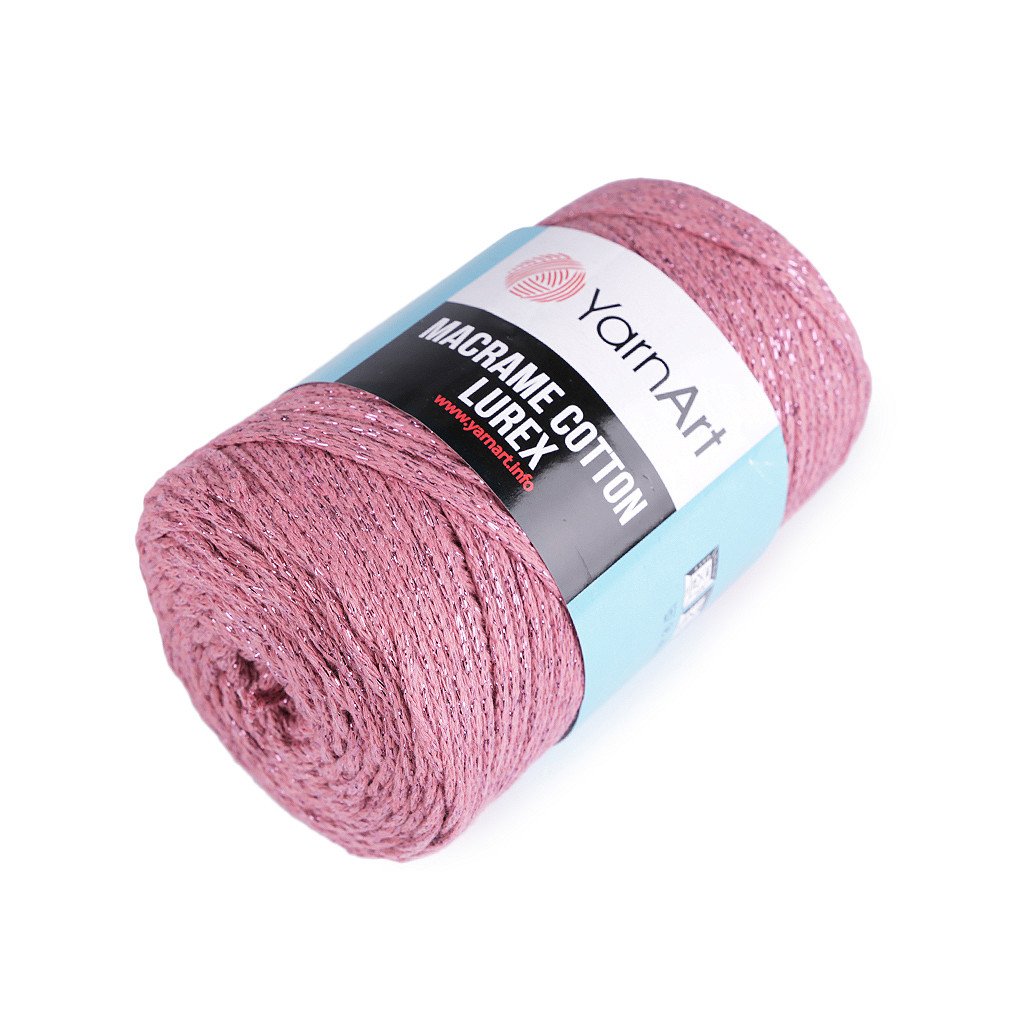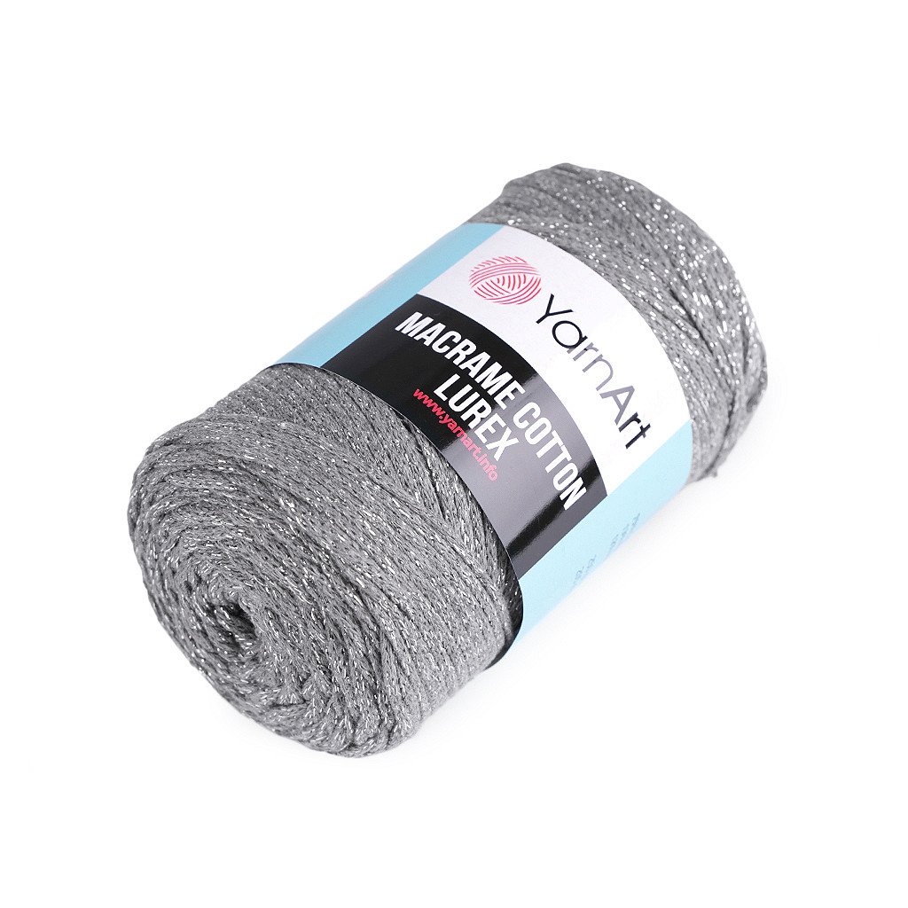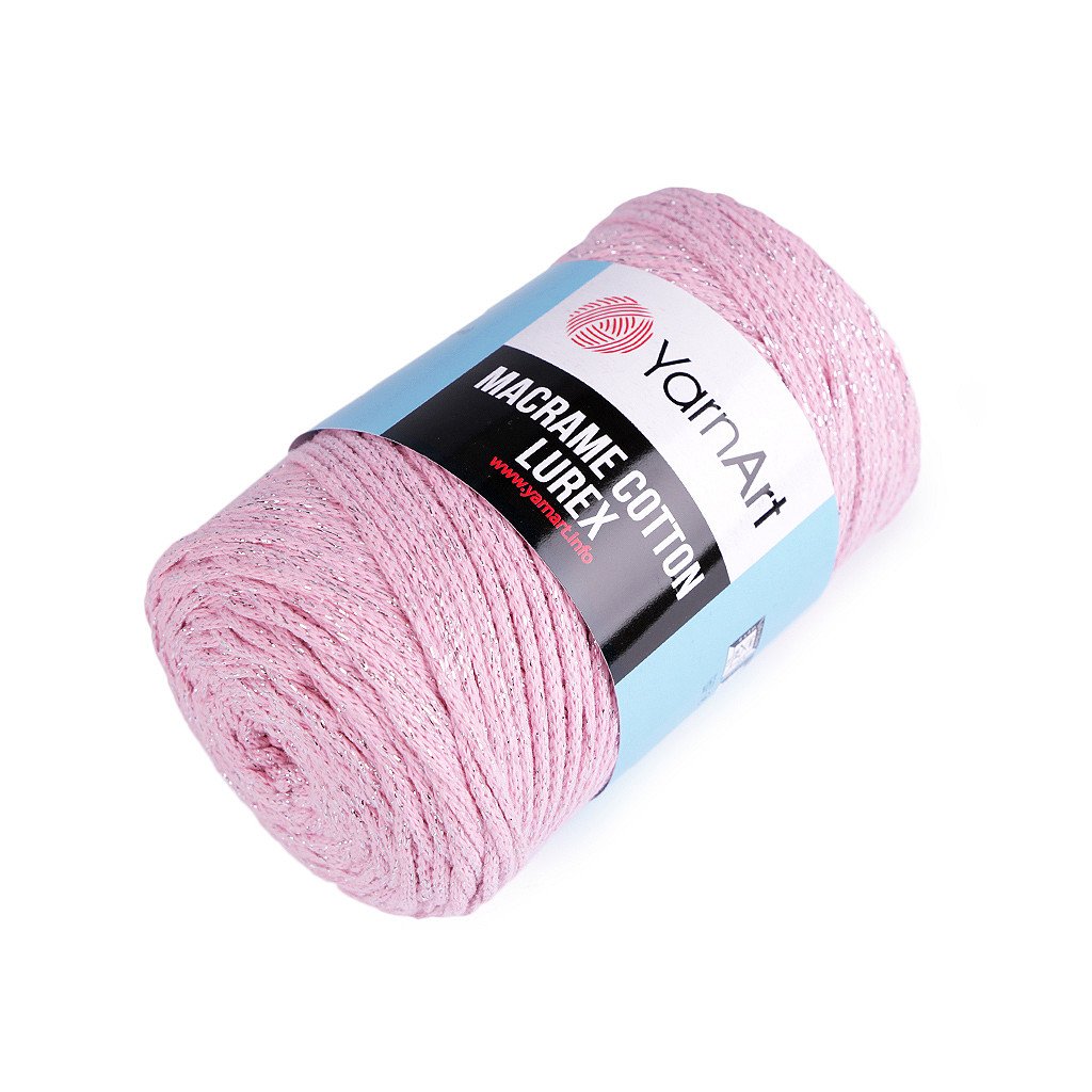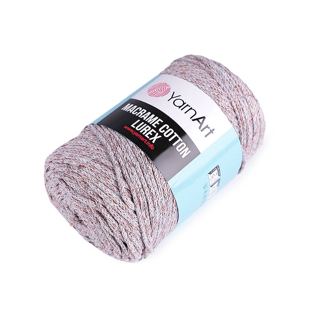 Příze Macrame Cotton připomíná provázek a je doplněna třpytivým lurexem. Využijete ji na pletení nebo háčkování pufů, košíků, koberečků i tašek.
