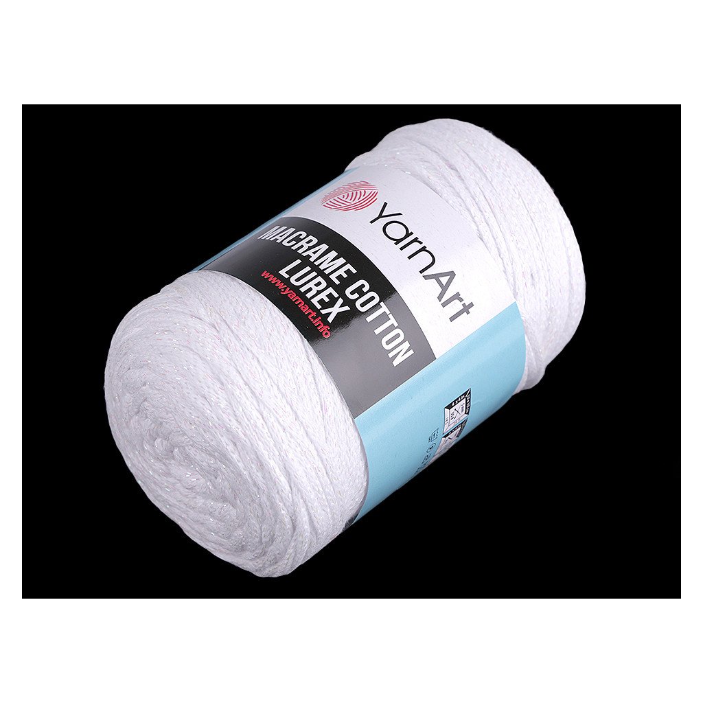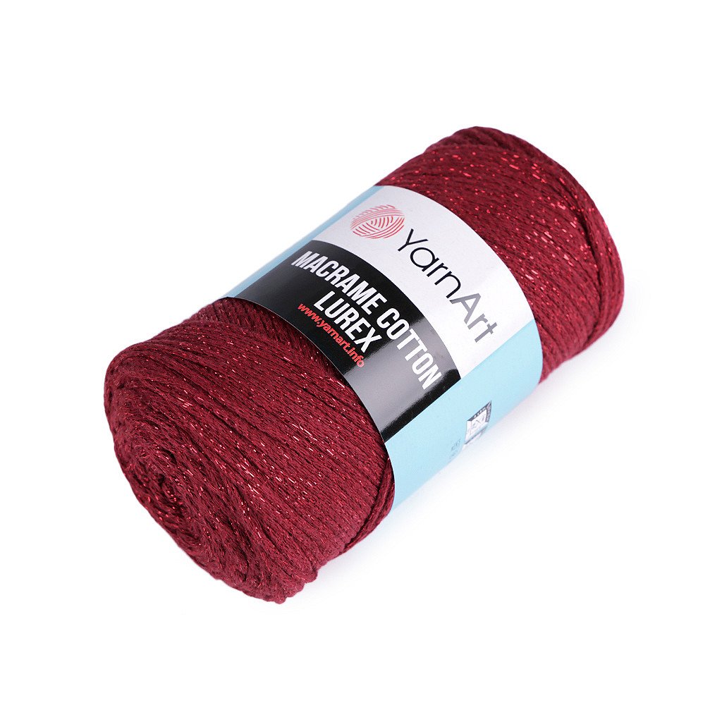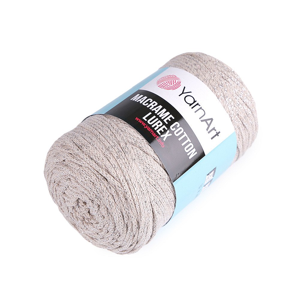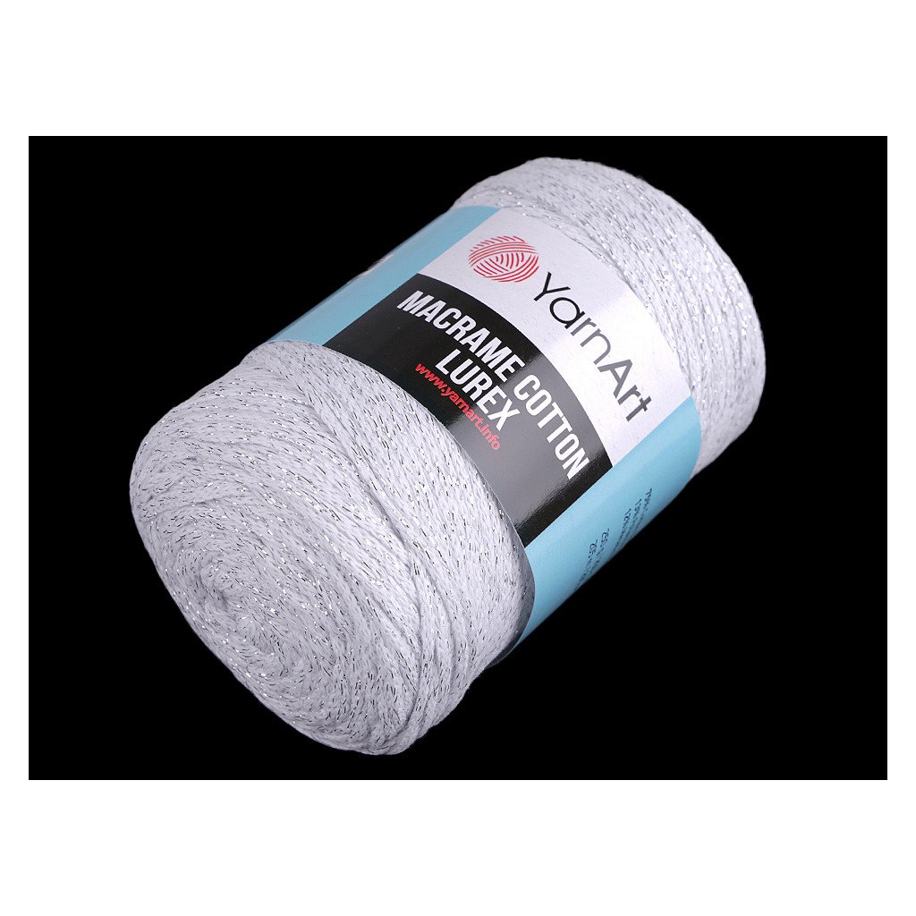 Příze Macrame Cotton připomíná provázek a je doplněna třpytivým lurexem. Využijete ji na pletení nebo háčkování pufů, košíků, koberečků i tašek.