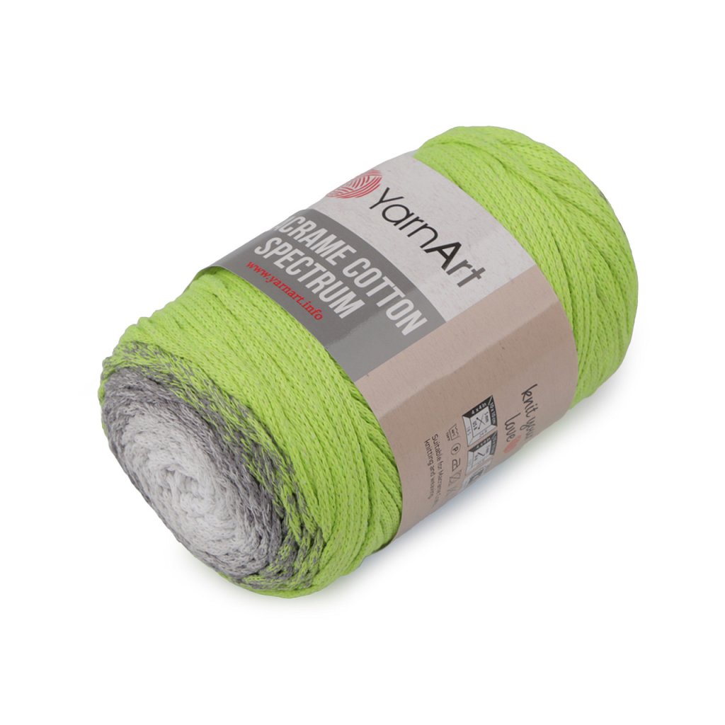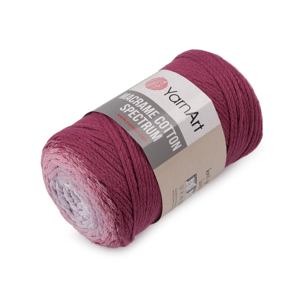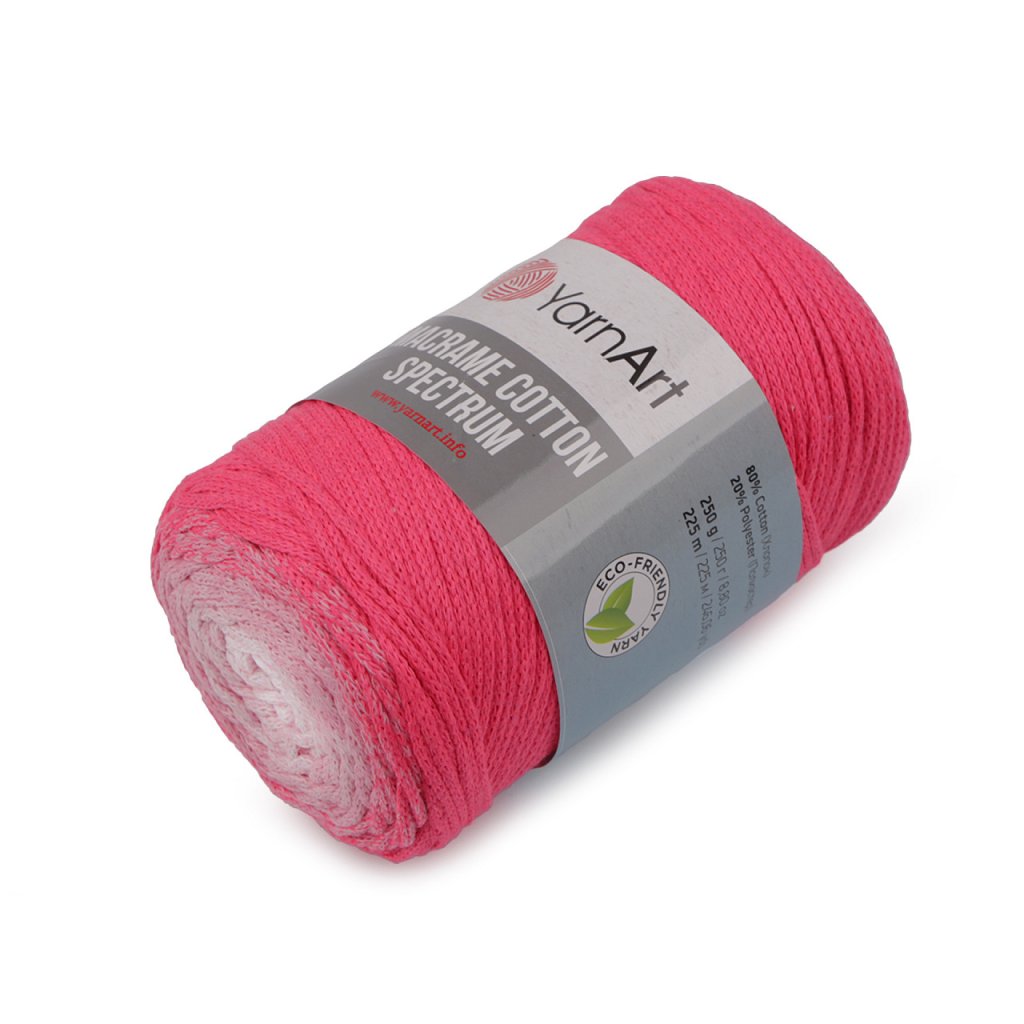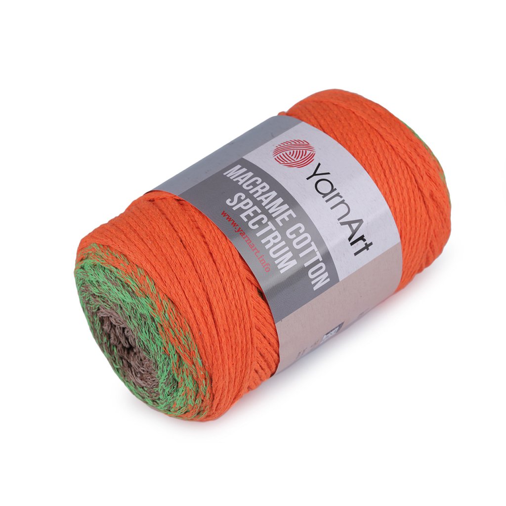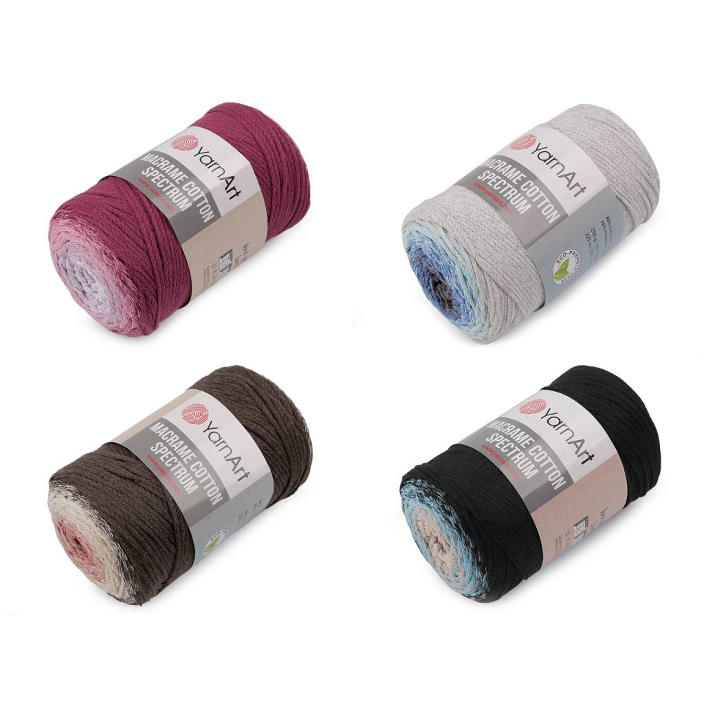 Příze Macrame Cotton Spectrum připomíná provázek. Je zajímavá svými barevnými přechody, se kterými budou všechny výrobky vypadat originálně. Využijete ji na pletení nebo háčkování pufů, košíků, koberečků i tašek, kde úžasně vyniknou její duhové přechody barev.
