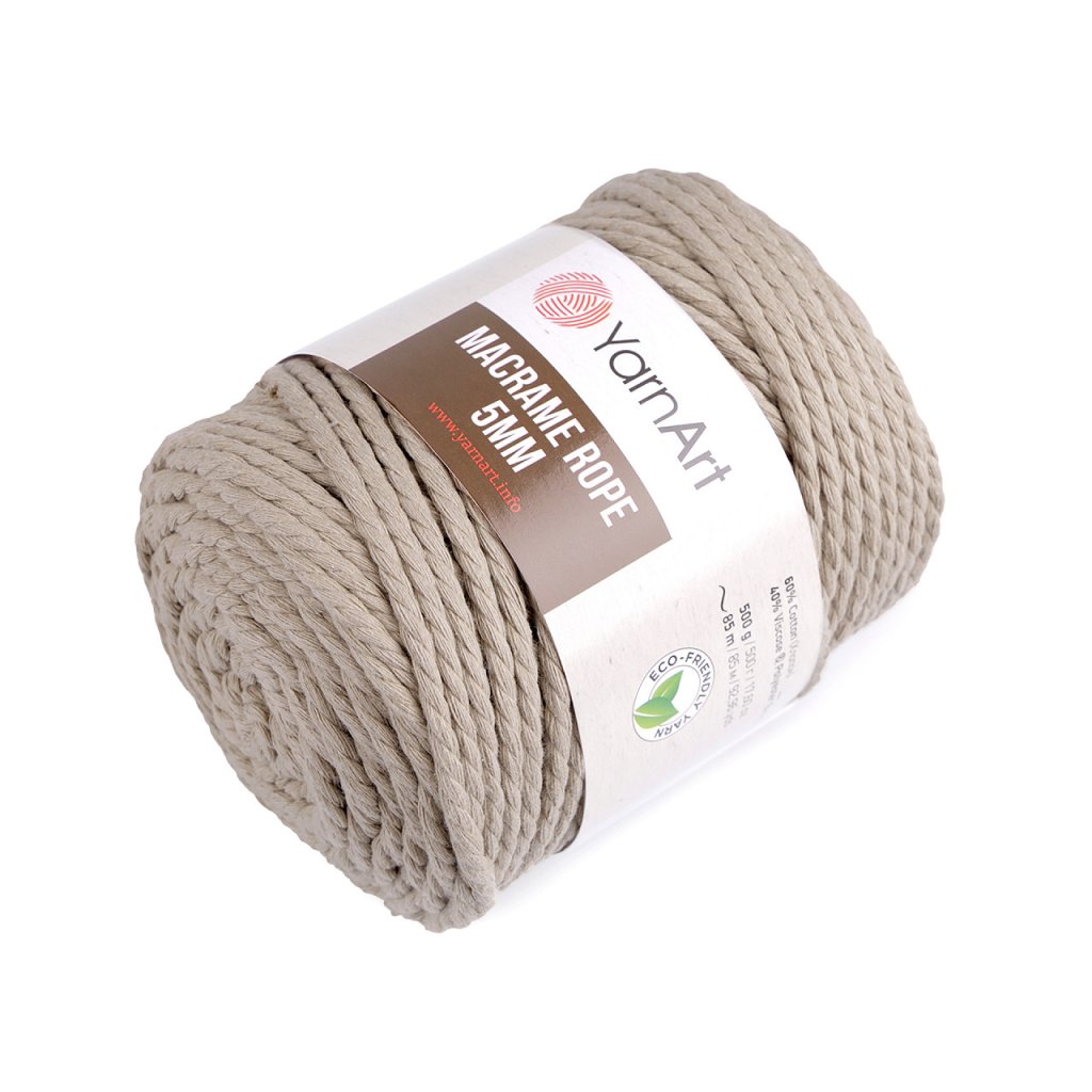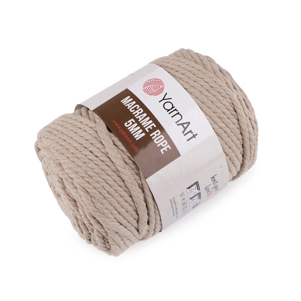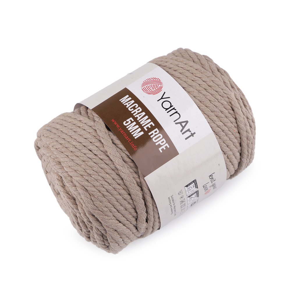Příze Macrame rope je kroucená a připomíná provázek. Využijete ji na pletení nebo háčkování pufů, košíků, koberečků i tašek. Je vhodná také na výrobu macramé dekorací.