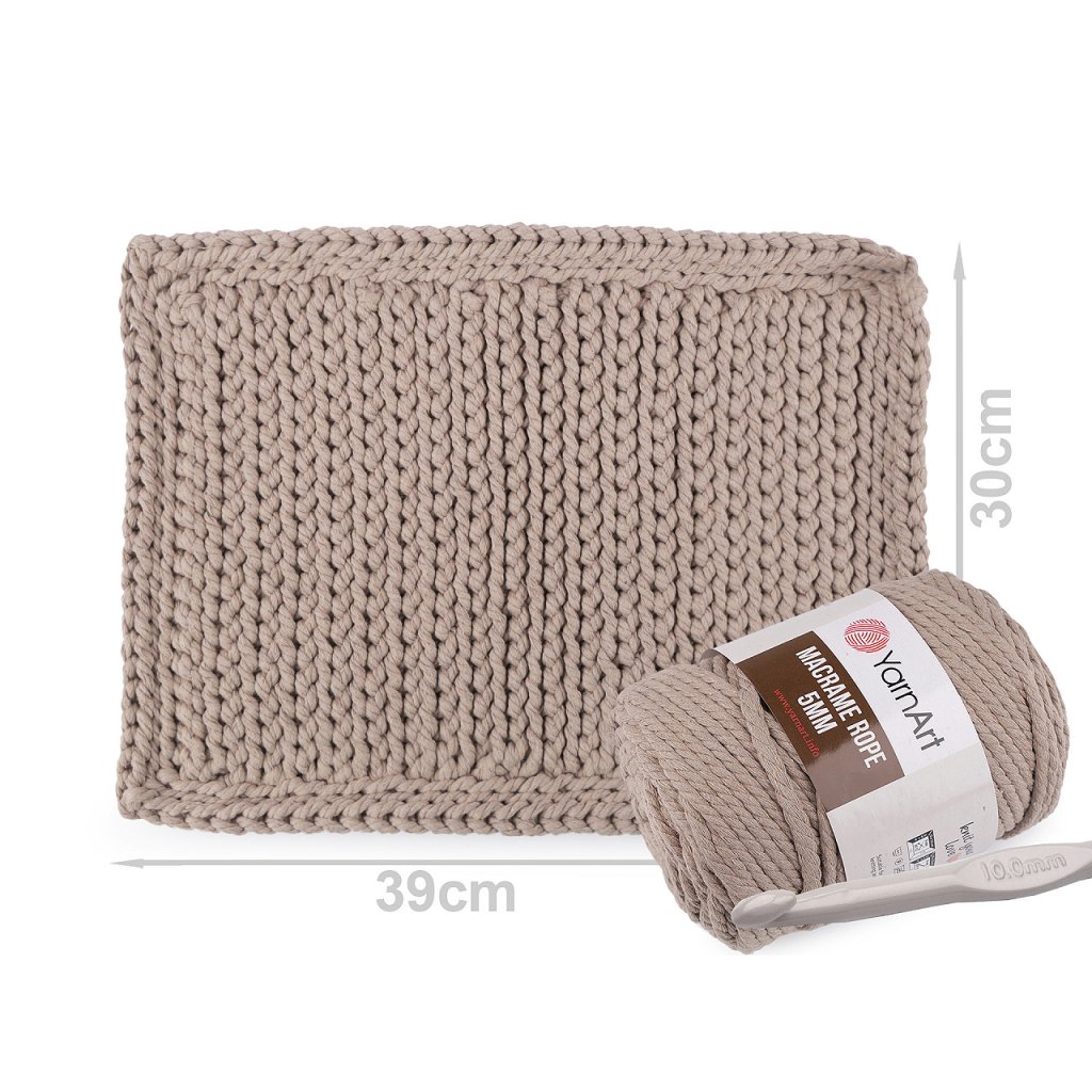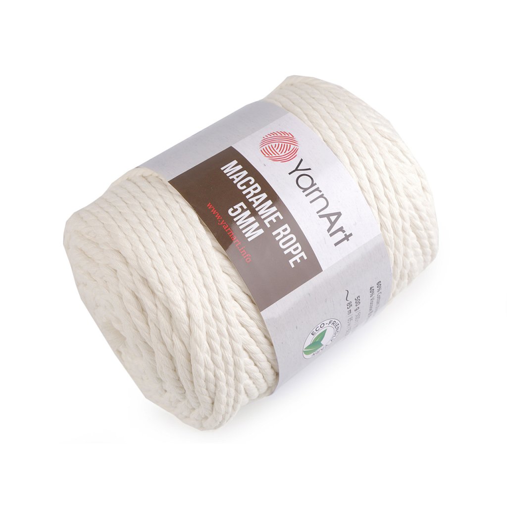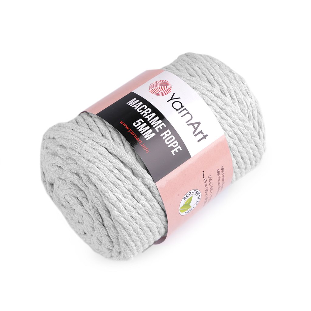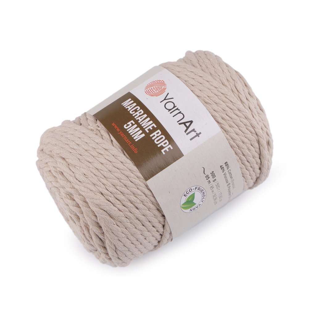 Příze Macrame rope je kroucená a připomíná provázek. Využijete ji na pletení nebo háčkování pufů, košíků, koberečků i tašek. Je vhodná také na výrobu macramé dekorací.