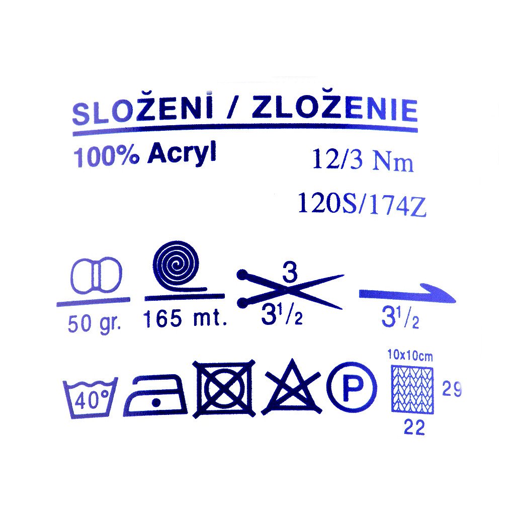 Pletací příze je vyrobena je 100 % akrylu. Je vhodná k pletení i háčkování zejména svetrů, halenek, čepic atd.