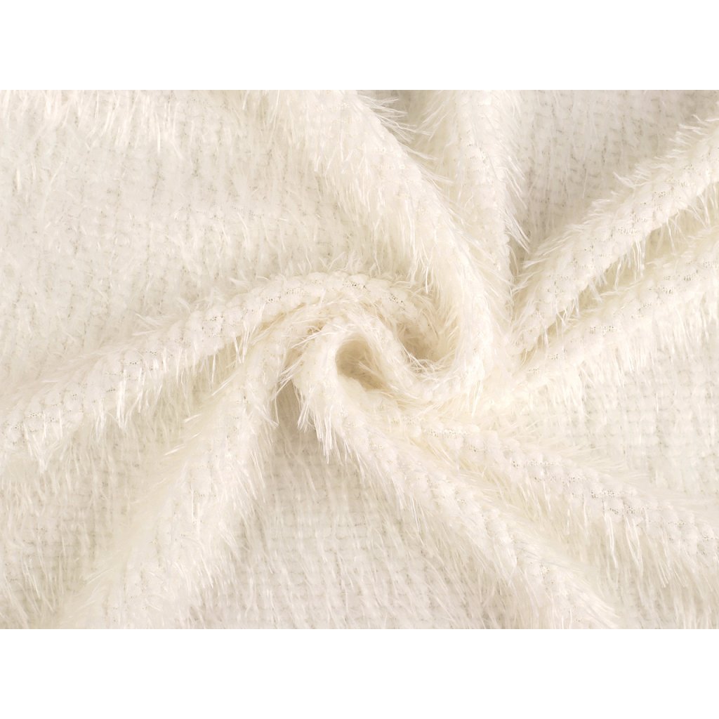 Chlupatá pletenina je měkká, jemná a příjemná na dotek. Pruží všemi směry (nejvíce po šíři). Můžete z ní ušít podzimní a zimní šaty, sukně, vesty, mikiny, kardigany, svetry, šály, plédy nebo čepice.