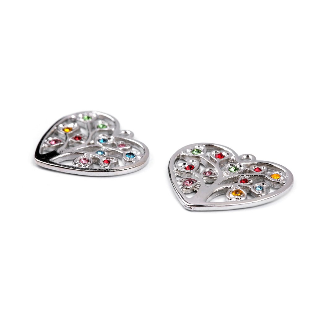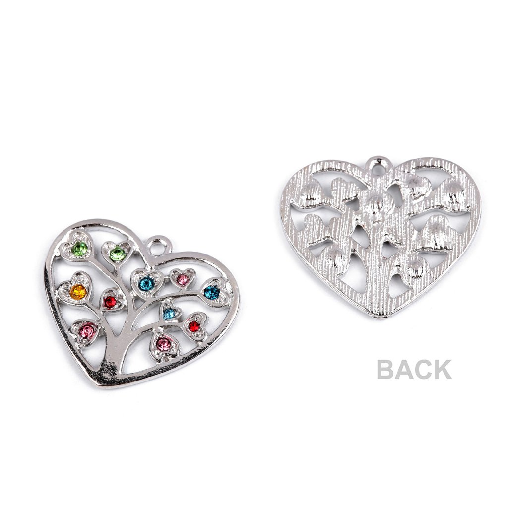 Kovový přívěsek ve tvaru srdce má uvnitř vkomponovaný strom života. Je ozdobený třpytivými broušenými kamínky. Využijete jej různými způsoby, je jednostranný, z nemagnetického kovu.