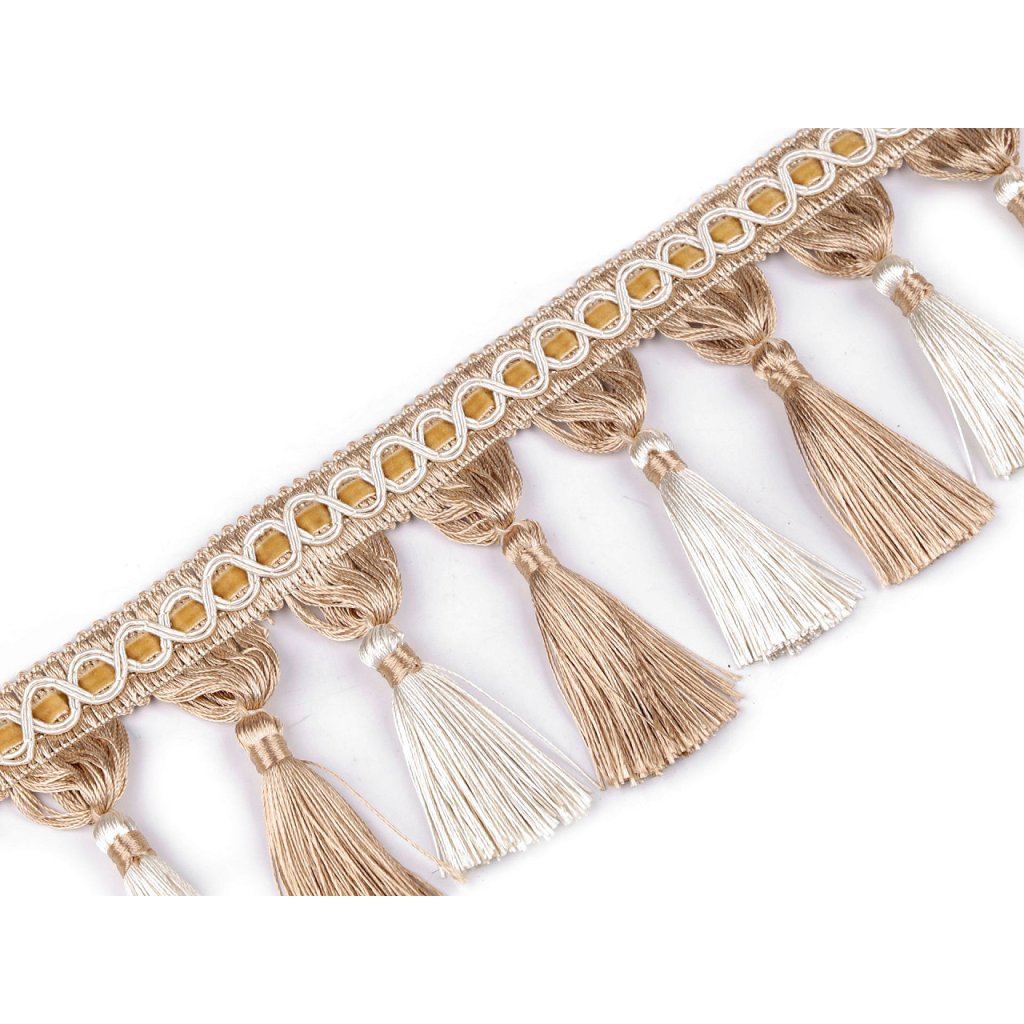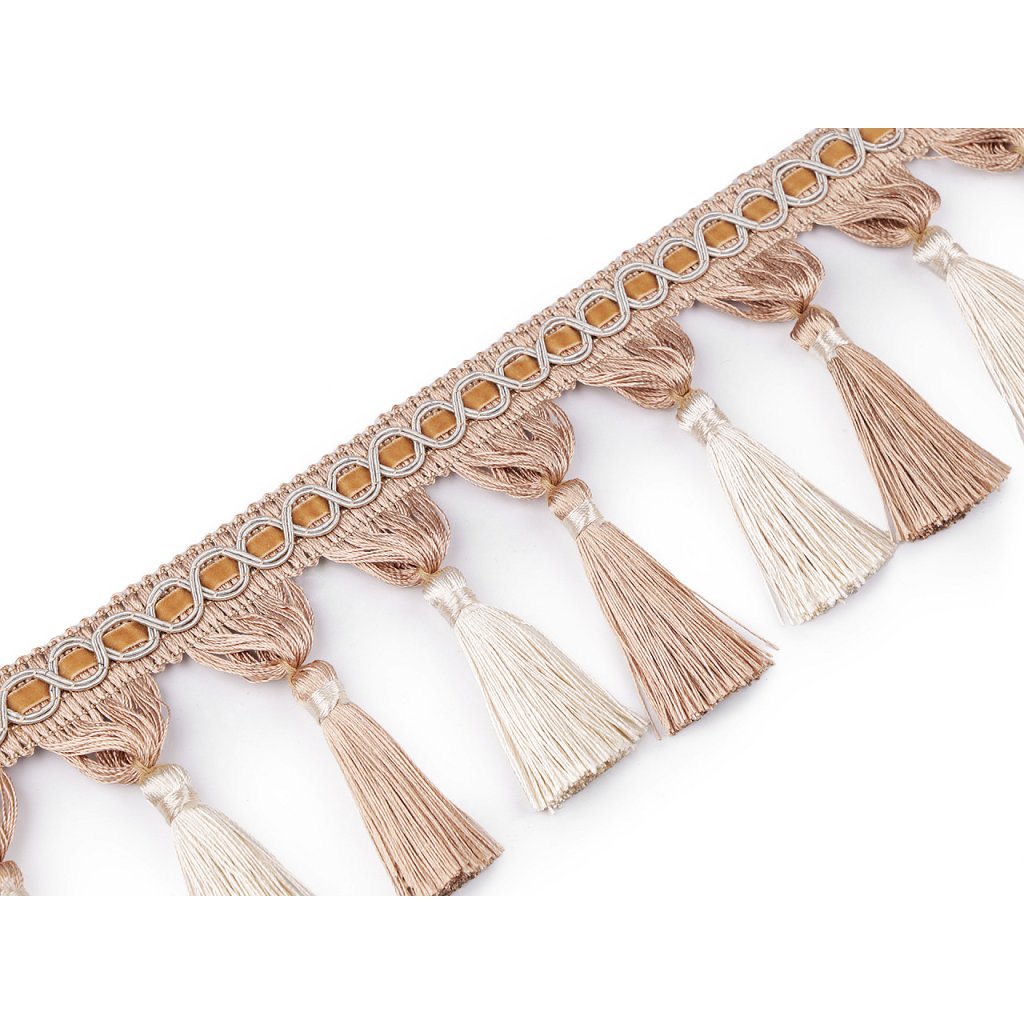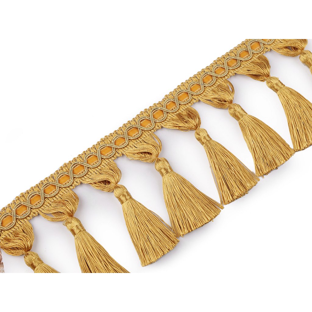 Prýmek s lesklými střapci je vhodný k ozdobení závěsů či k olemování nábytku (křesel, pohovek apod.). Horní částí je provlečená sametová stuha.
