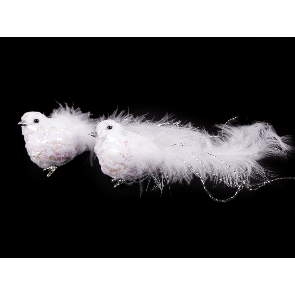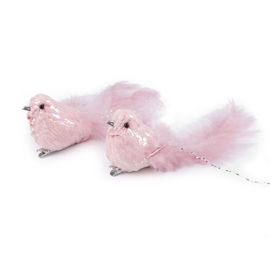 Dekorační ptáček působí něžně a romanticky. Tělo má pokryté jemným plyšem a najdete na něm i odlesky s AB efektem. Zespodu má připevněnou kovovou sponu, díky které můžete ptáčka připevnit například na věnec, větvičku, záclonu či ho naaranžovat do květinových vazeb. Zajímavě vynikne na vánočním stromečku.