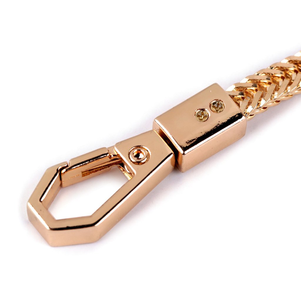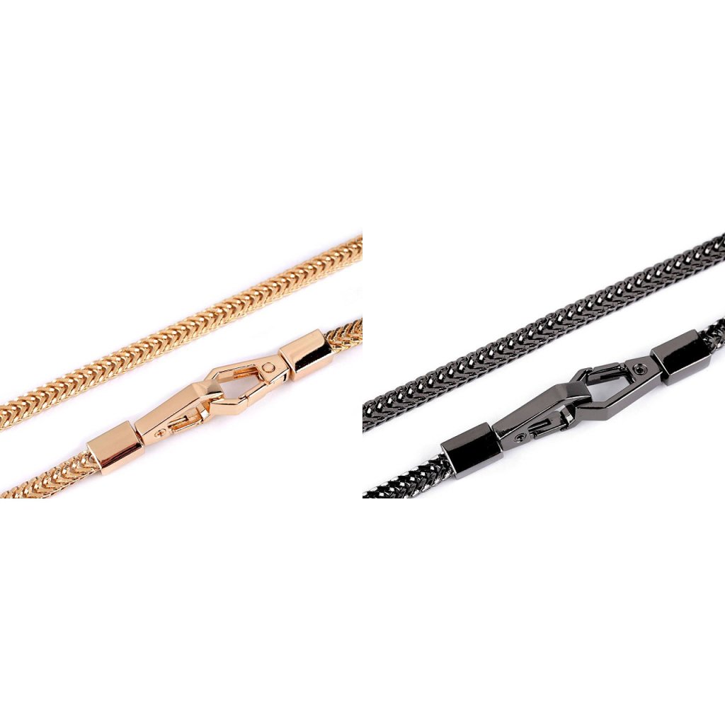 Plochý řetízek vyniká svým kvalitním zpracováním a vysokým leskem. Využijete ho na menší kabelky a psaníčka. Na obou jeho koncích najdete připevněné karabinky, které mají nevšední hranatý design.