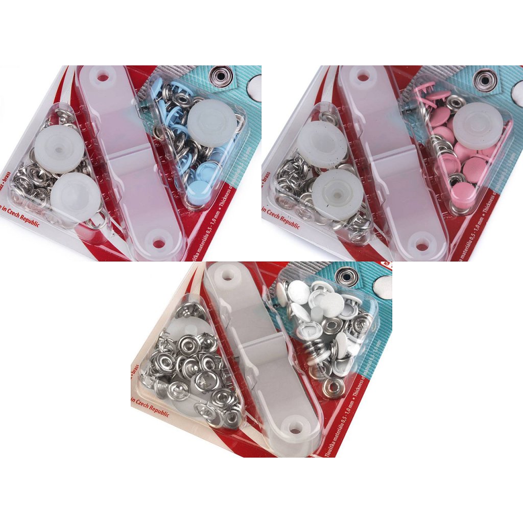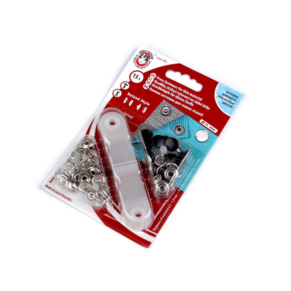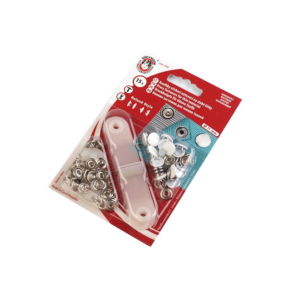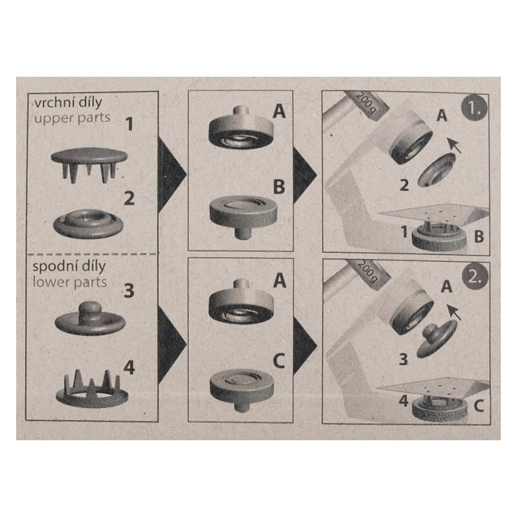 Stiskací knoflíky Roland style využijete ke spojování jemných a poddajných druhů látek - froté, úplet, košilovina aj. Nýtování se provádí mini lisem, který je součástí balení.