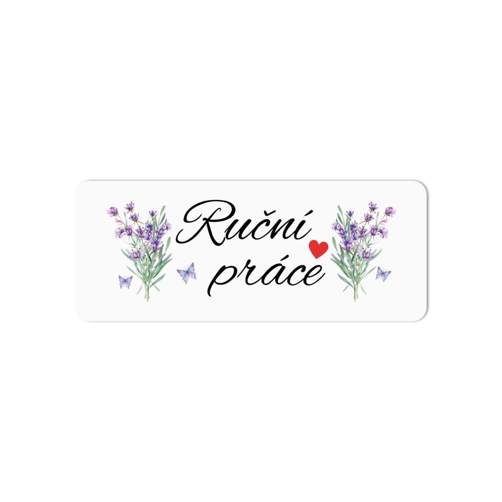 Štítek "Ruční práce" levandulová, 5x2 cm, umělá kůže, bílá
