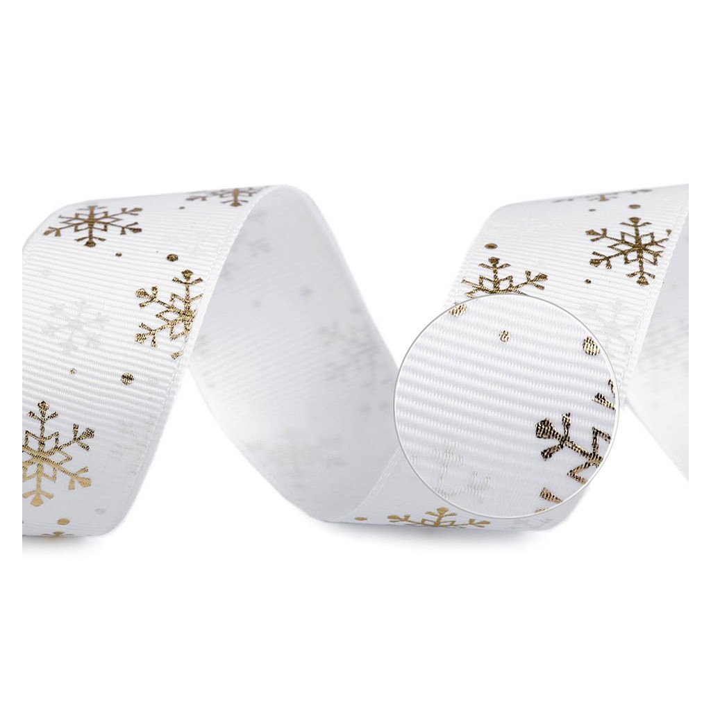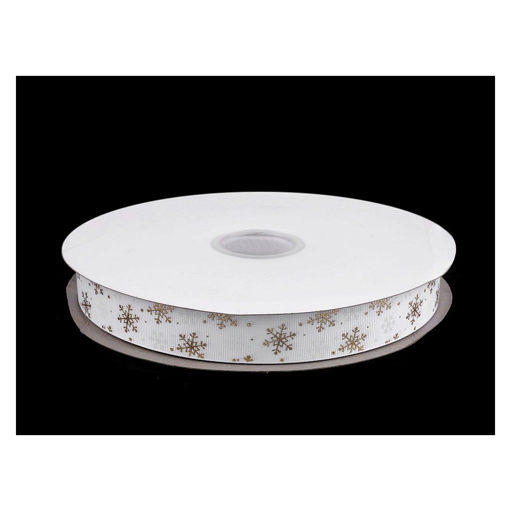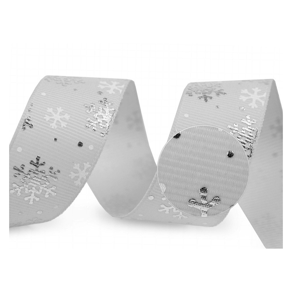 Dekorační rypsová stuha s potiskem sněhových vloček má na povrchu typické jemné žebrování. Potisk je jednostranný.
