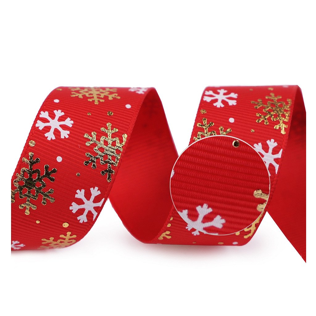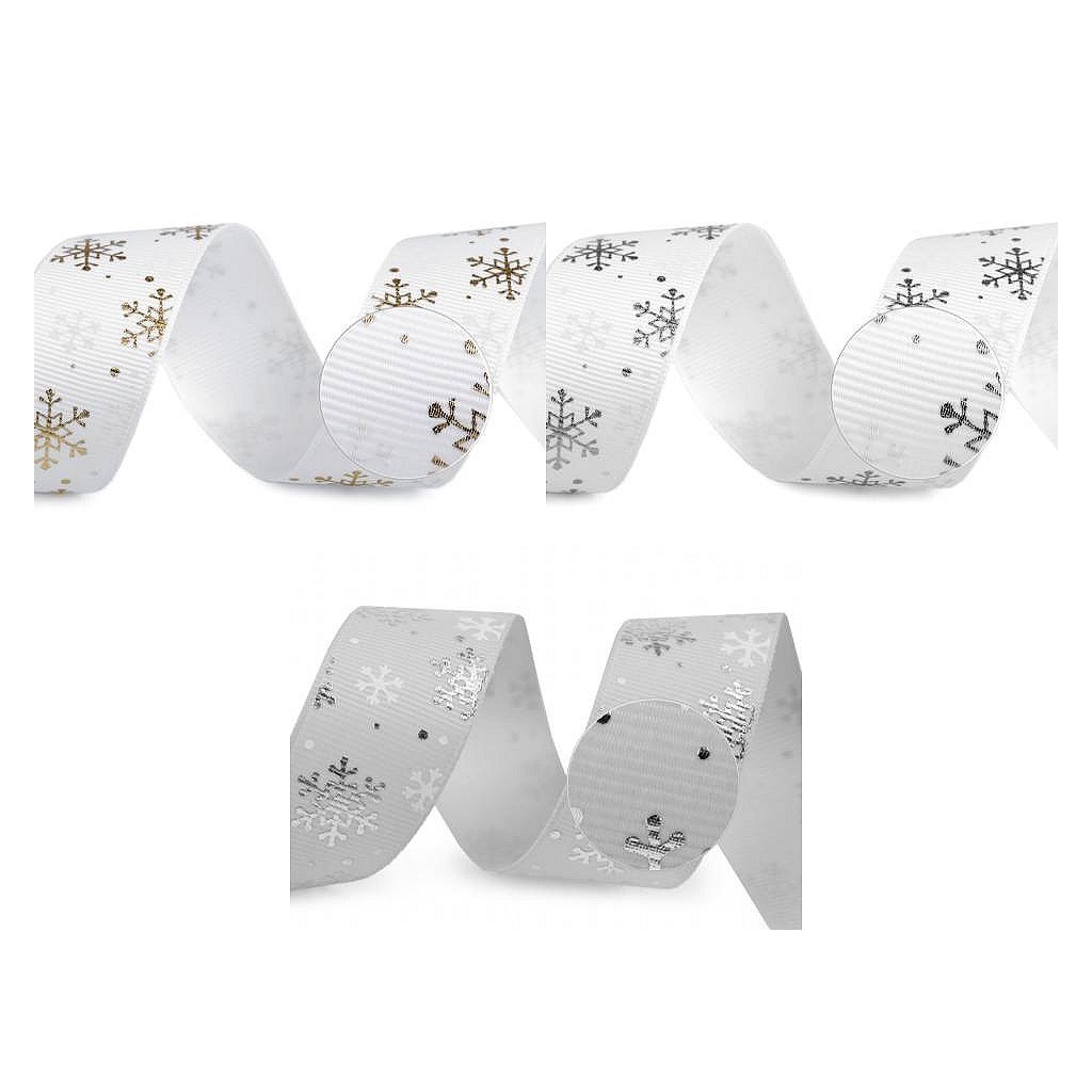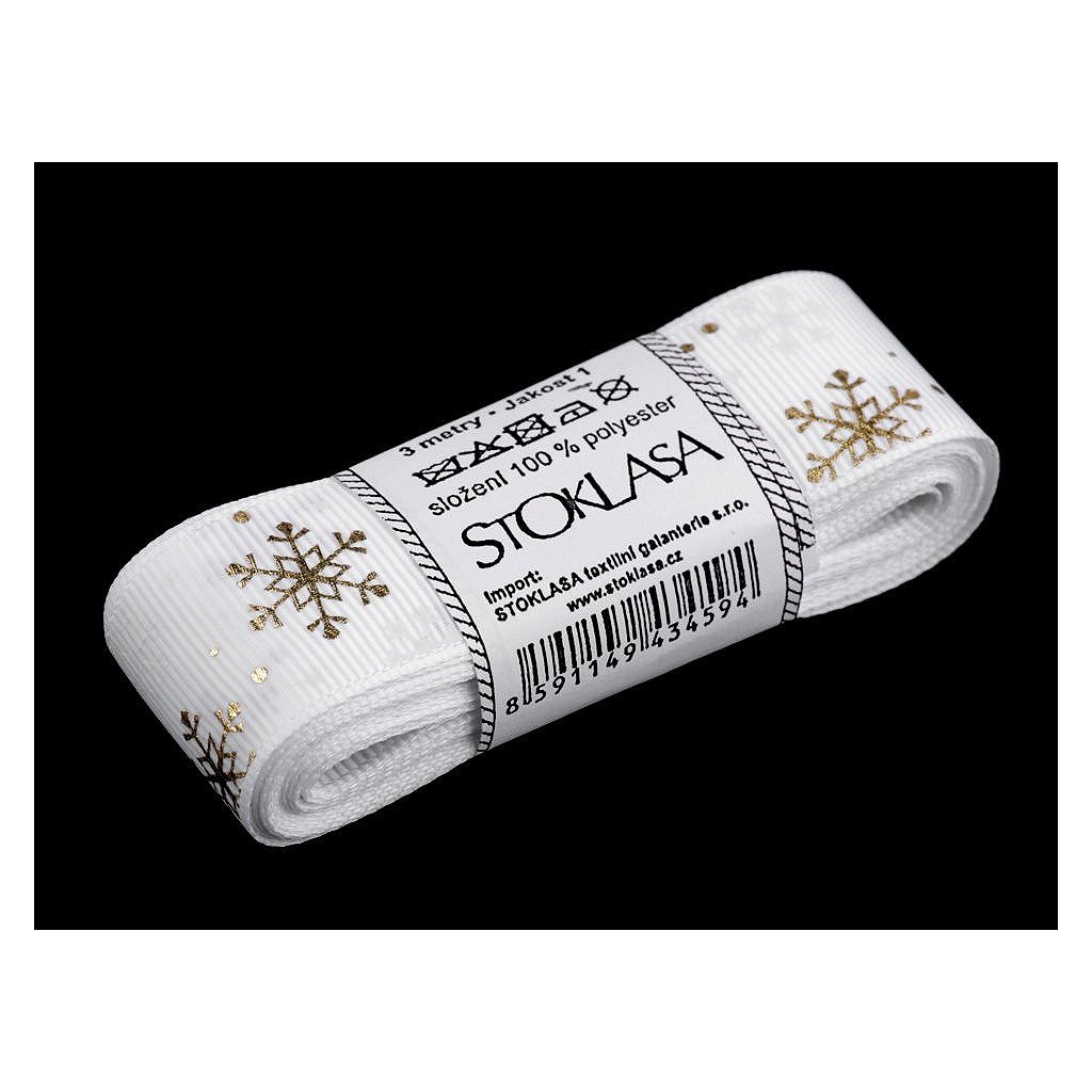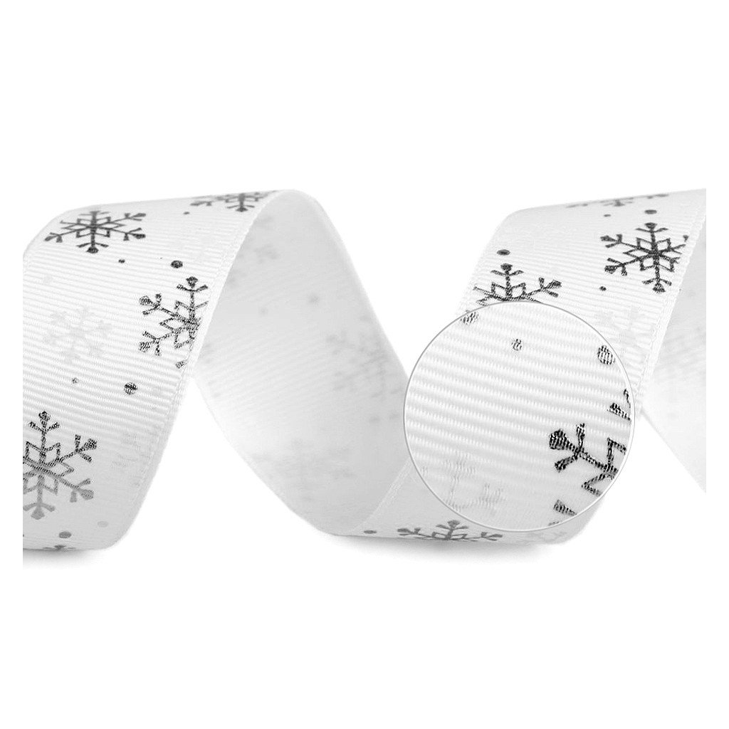Dekorační rypsová stuha s potiskem sněhových vloček má na povrchu typické jemné žebrování. Potisk je jednostranný.