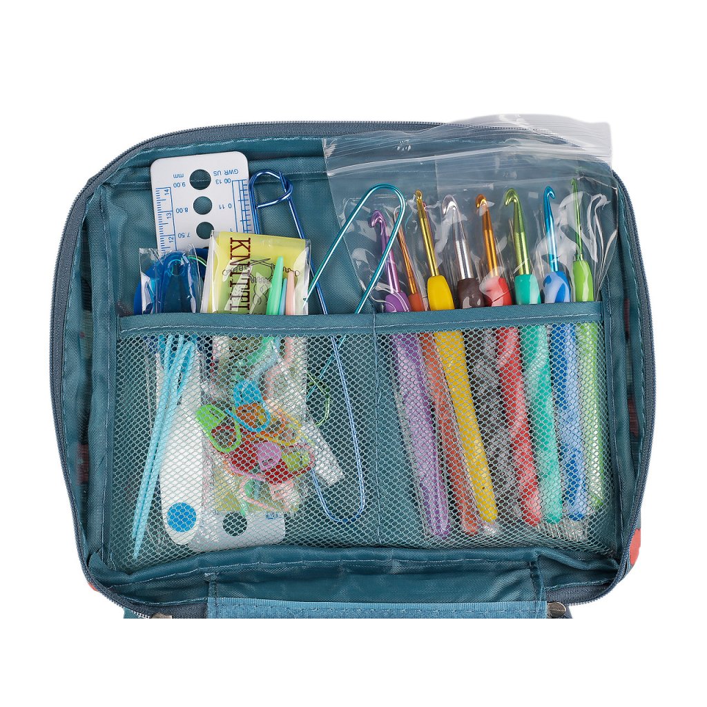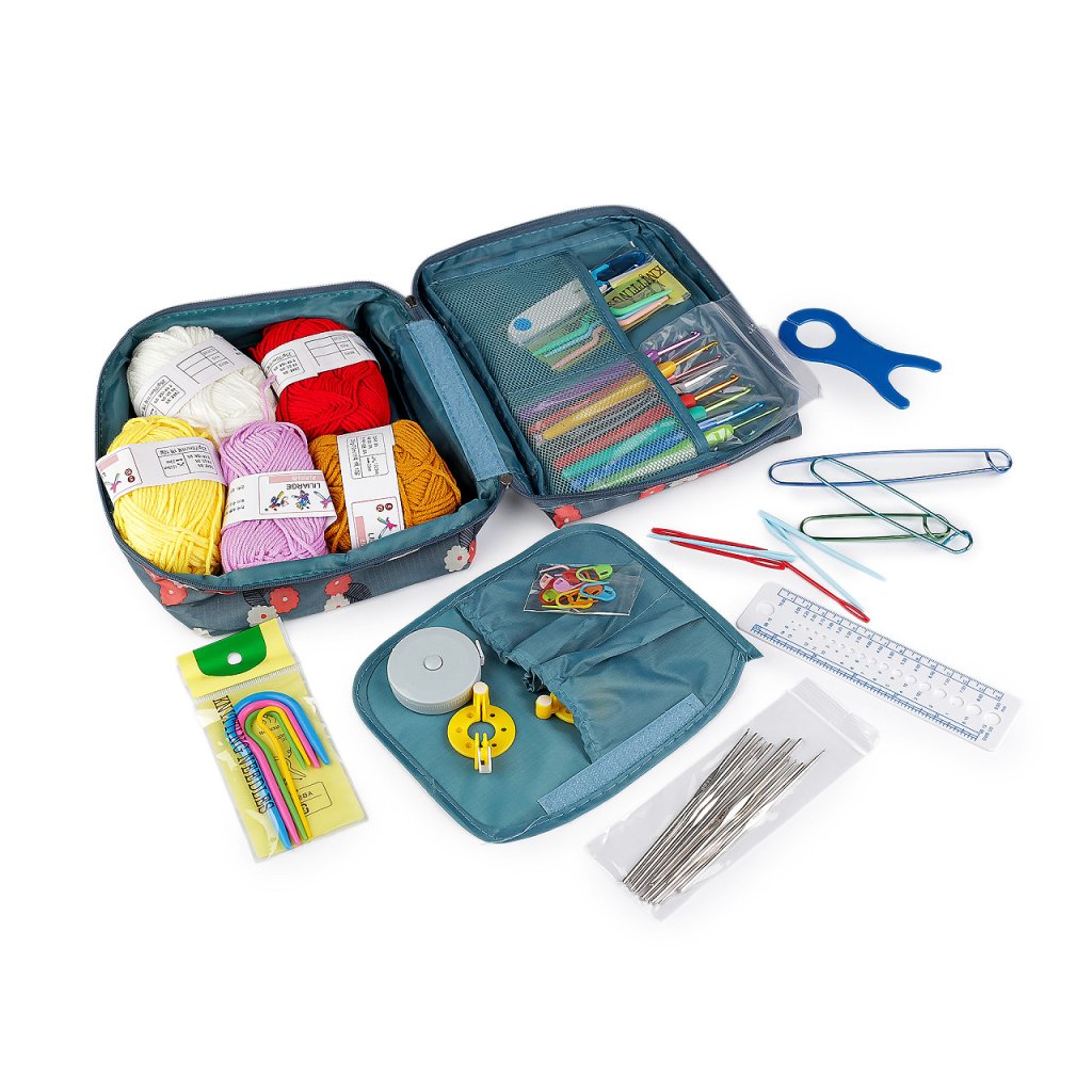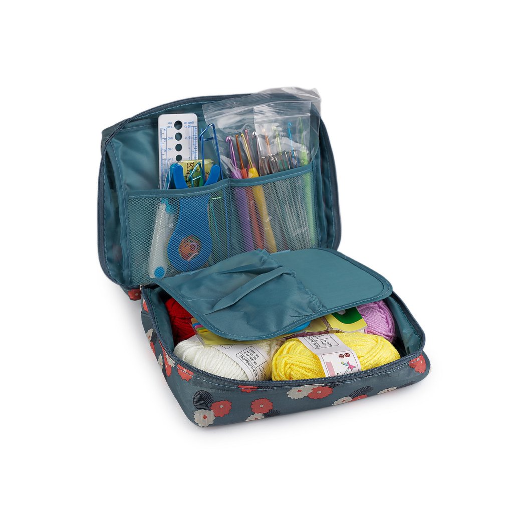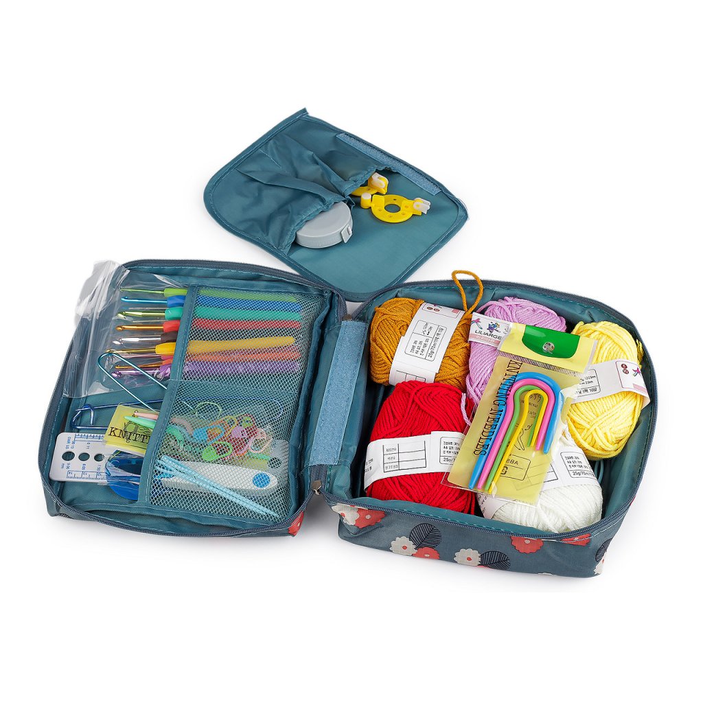 Sada háčků a pomůcek na háčkování je uložená v textilním pouzdře, které můžete snadno uzavřít pomocí zipu. Praktické pouzdro umožňuje snadnou organizaci a přenášení, ať už pracujete doma nebo na cestách.