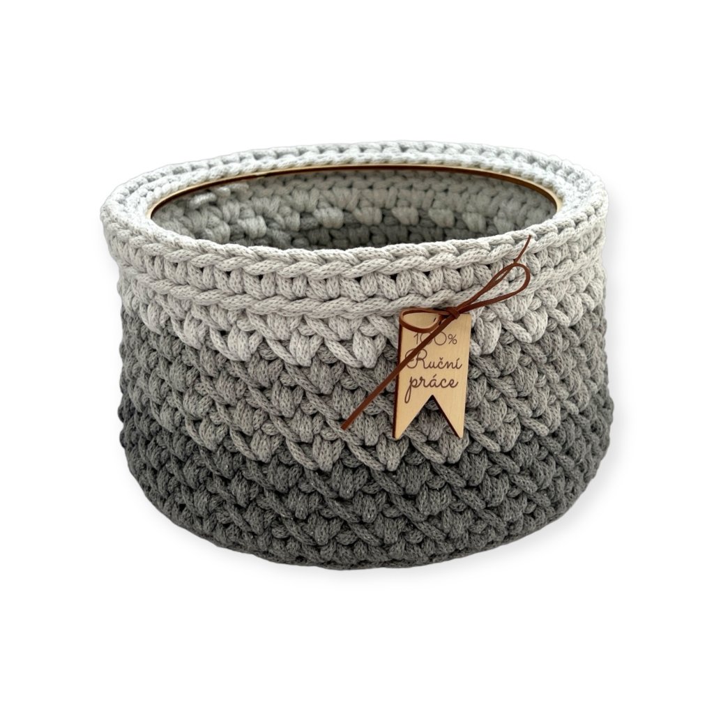Sada na výrobu háčkovaného košíku s prstencem a stylovým víkem. Vytvoříte si tak pevný košík, který bude mít díky prstenci pevný lem, na který snadno dosedne dřevěné víko.
