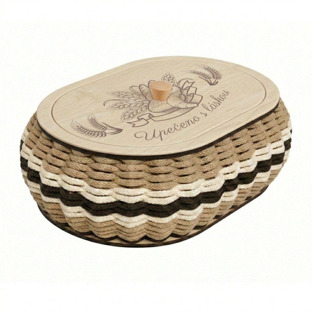 Oválná sada z přírodní březové překližky pro vyplétaný košík 30x20 cm s barevným UV potiskem Upečeno s láskou na víku. Konstrukce obsahuje vše pro snadné sestavení i upletení košíku.