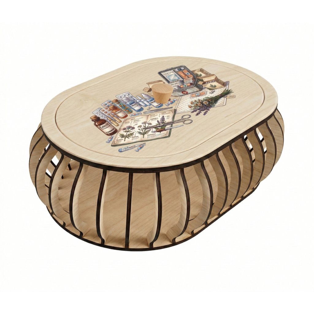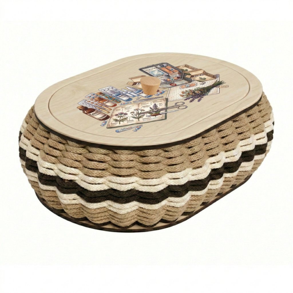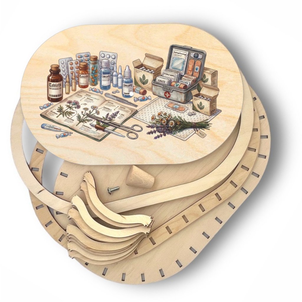Oválná sada z přírodní březové překližky pro vyplétaný košík 30x20 cm s barevným UV potiskem moderní lékárničky. Konstrukce je ideální pro začátečníky a obsahuje vše potřebné pro snadné sestavení.
