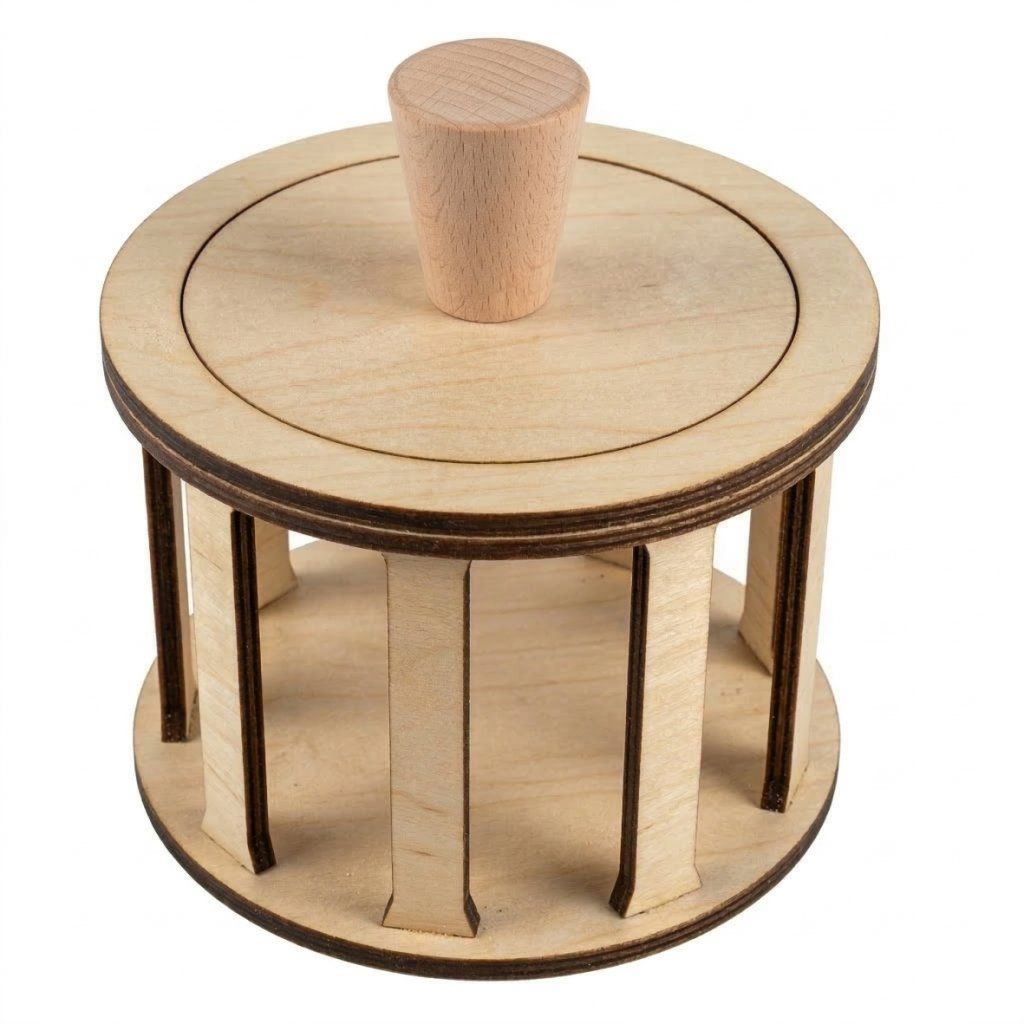 - Obsah balení: dno, sada sloupků, horní obruč, extra horní prstenec, víko s dřevěnou knopkou a šroubkem