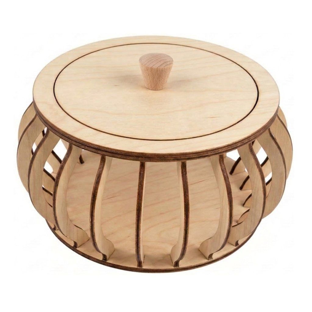 Kruhová sada z přírodní březové překližky pro vyplétaný košík o průměru 18 cm. Nevyžaduje háčkování, šetří přízi a obsahuje vše pro snadné sestavení včetně víka a krycího prstence.