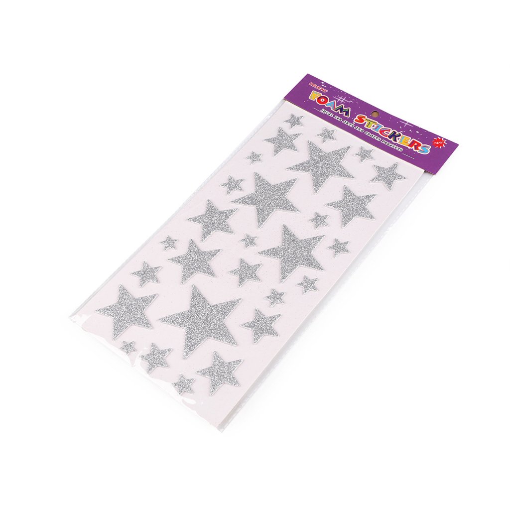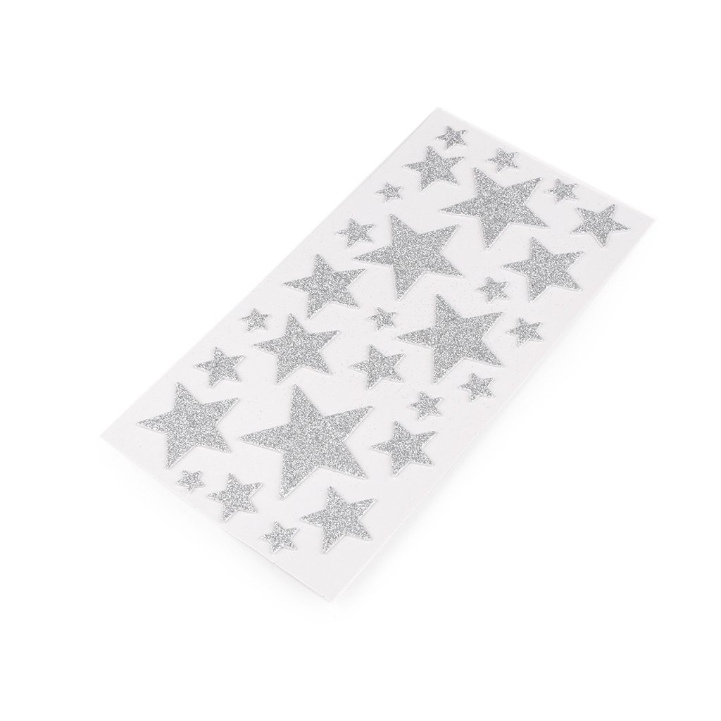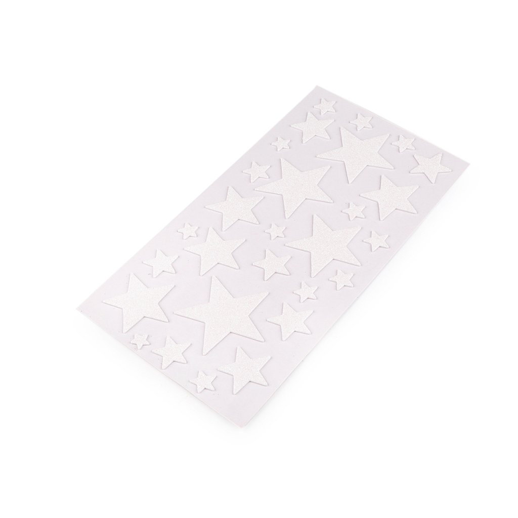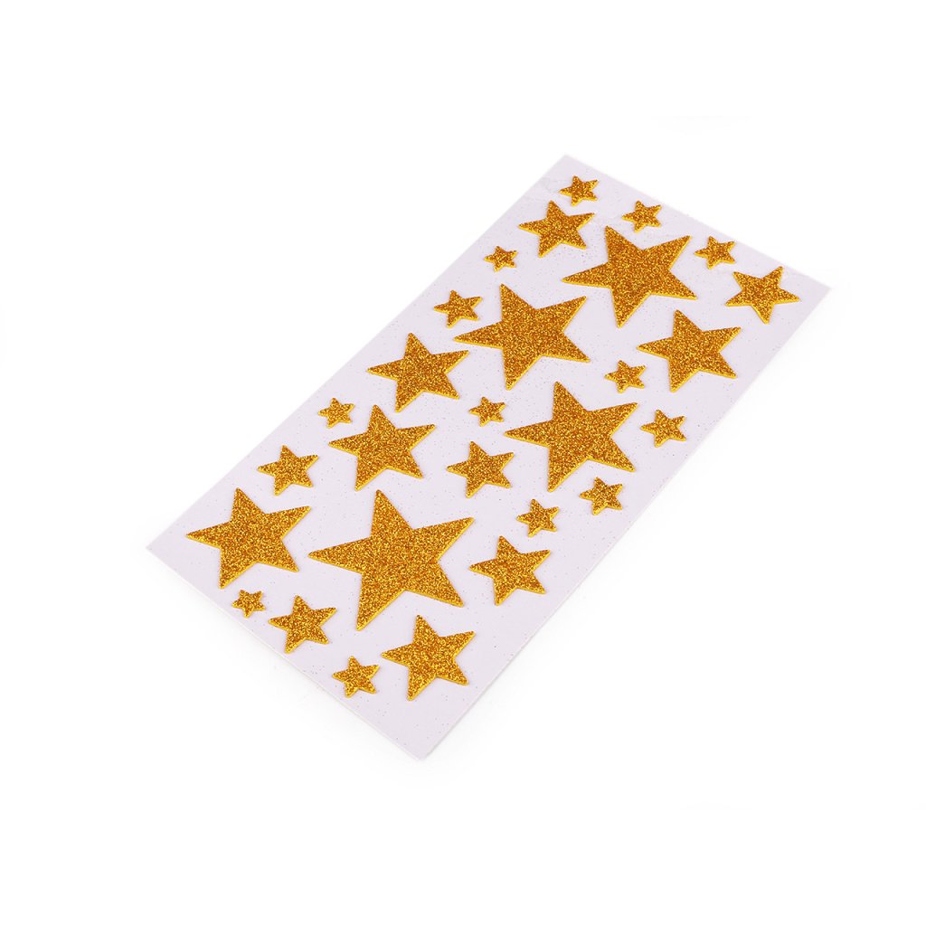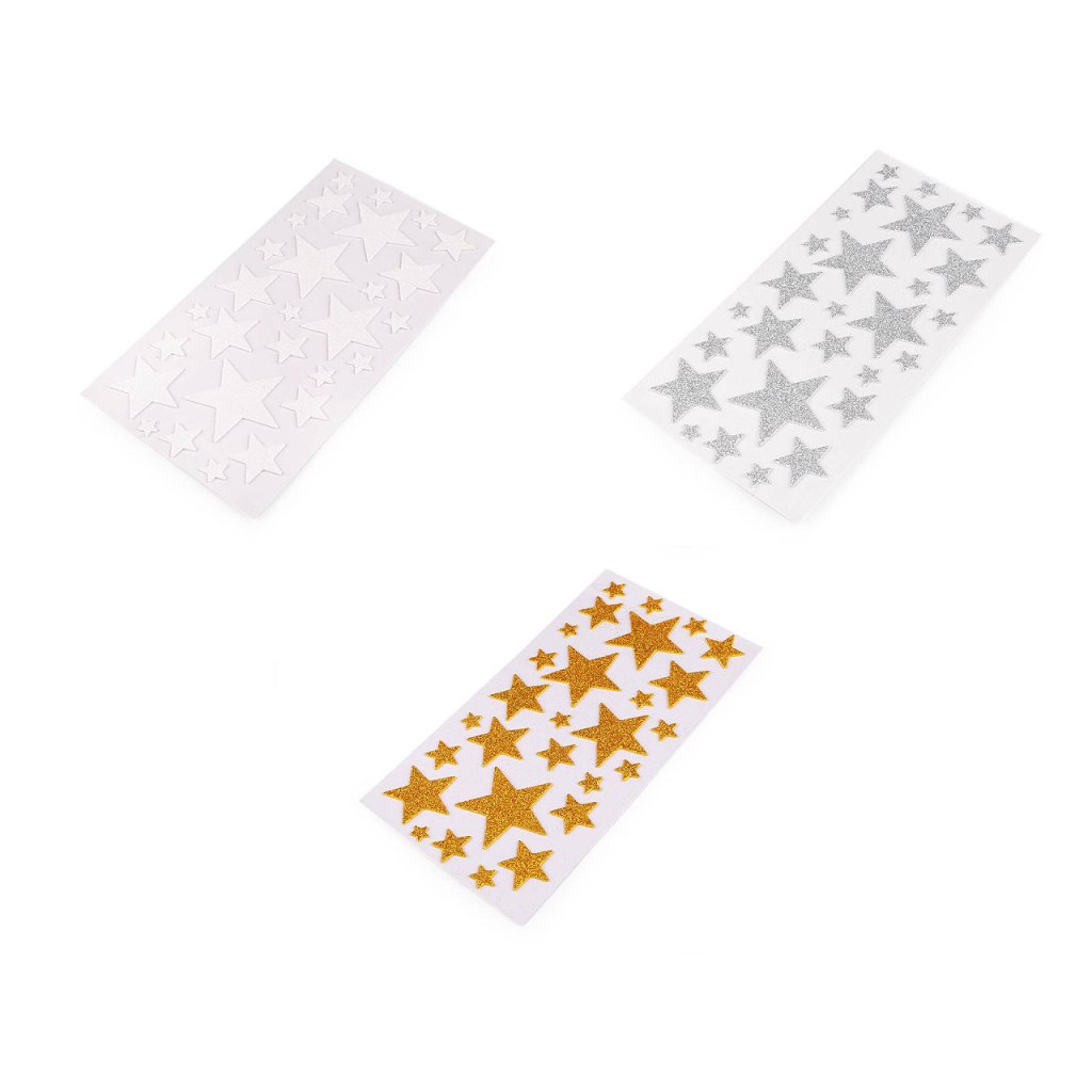Dekorační hvězdy s glitry jsou vyrobené z pěnové gumy (moosgummi). Na spodní straně mají samolepicí vrstvu. Jsou vhodné k nalepení na zabalené dárky, pozvánky, krabičky, alba, deníky apod. Jsou nalepené na jednom archu podkladové folie, ze které se pohodlně odlepí.