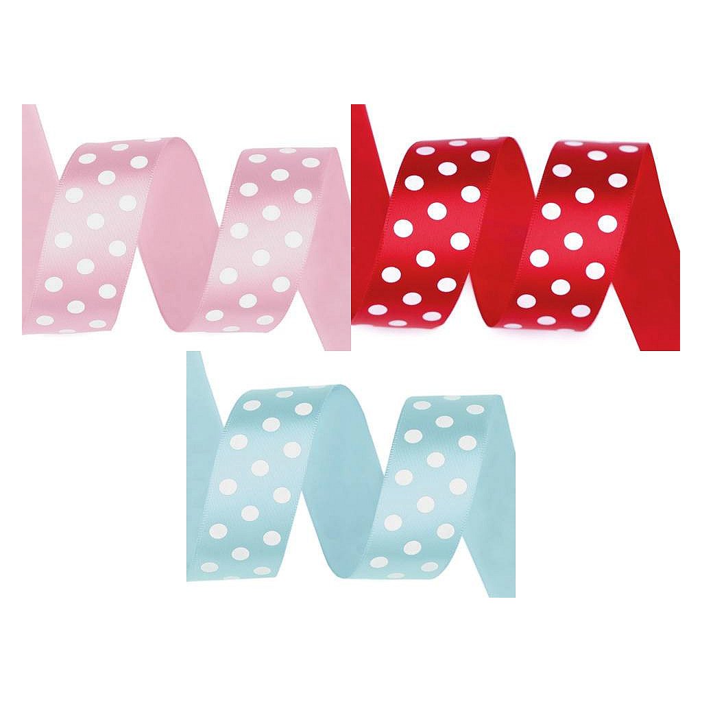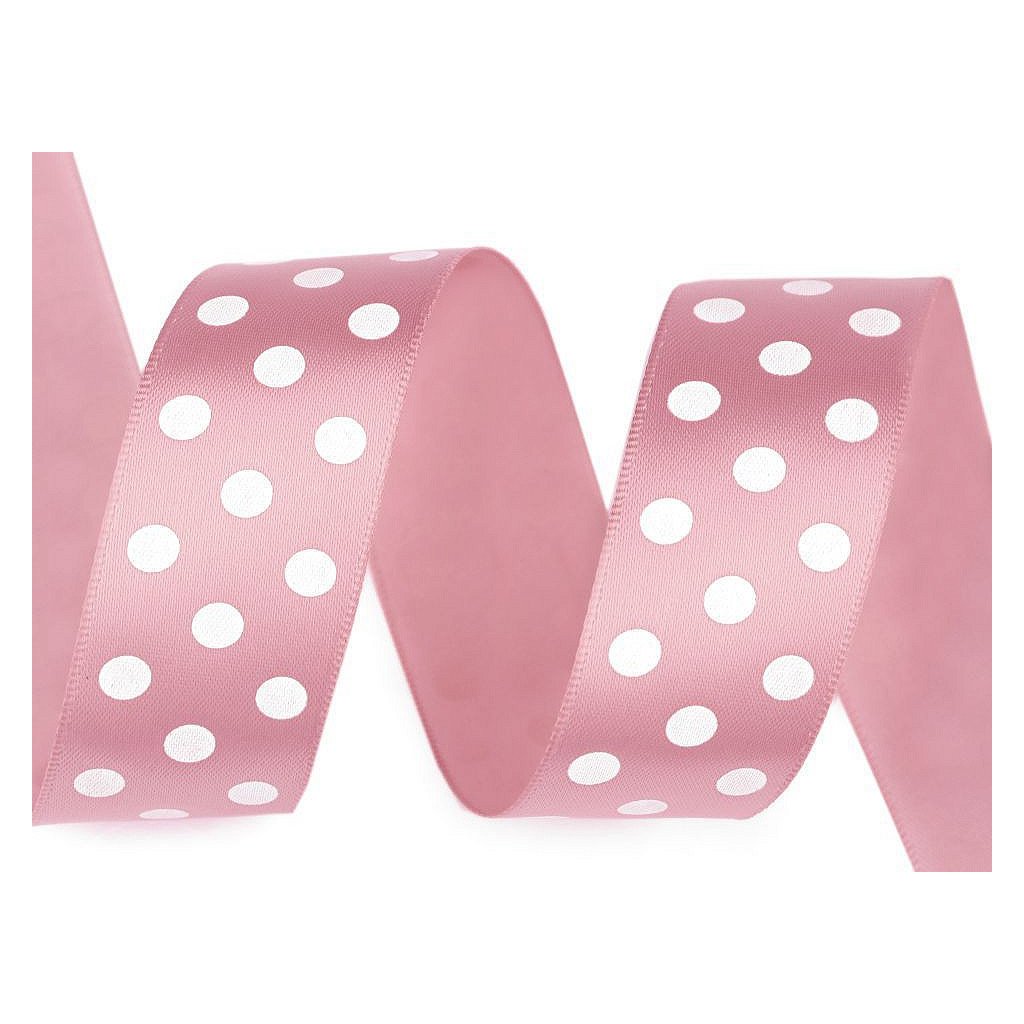 Saténovou stuhu zdobí potisk puntíků, který je jednostranný. Její povrch se jemně leskne.