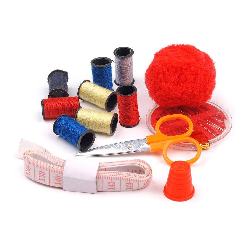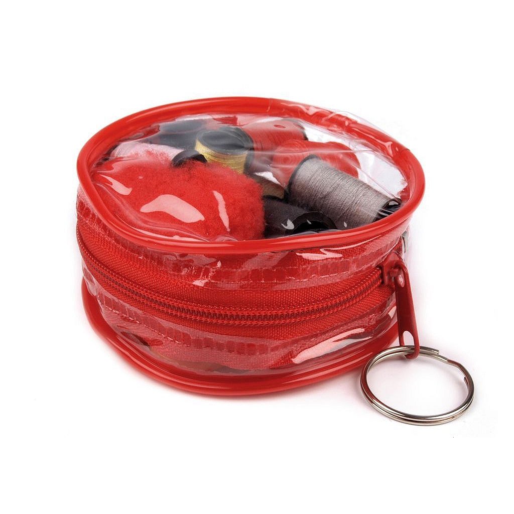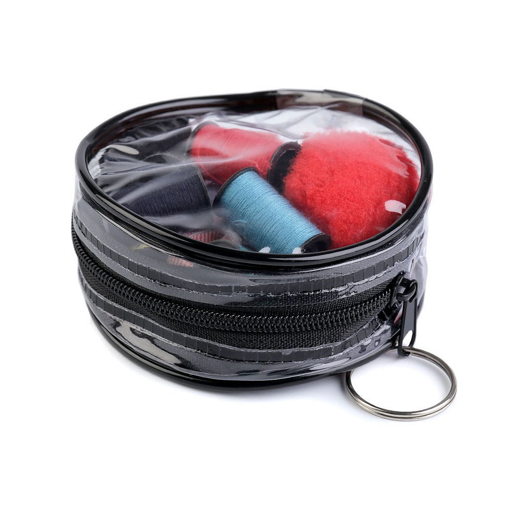 Velmi praktické šitíčko v průhledné taštičce o průměru 7,5 cm se zipovým zapínáním. Obsahuje 8 cíveček nití různých barev, sadu ručních jehel, jehelníček, metr, náprstek a nůžky.