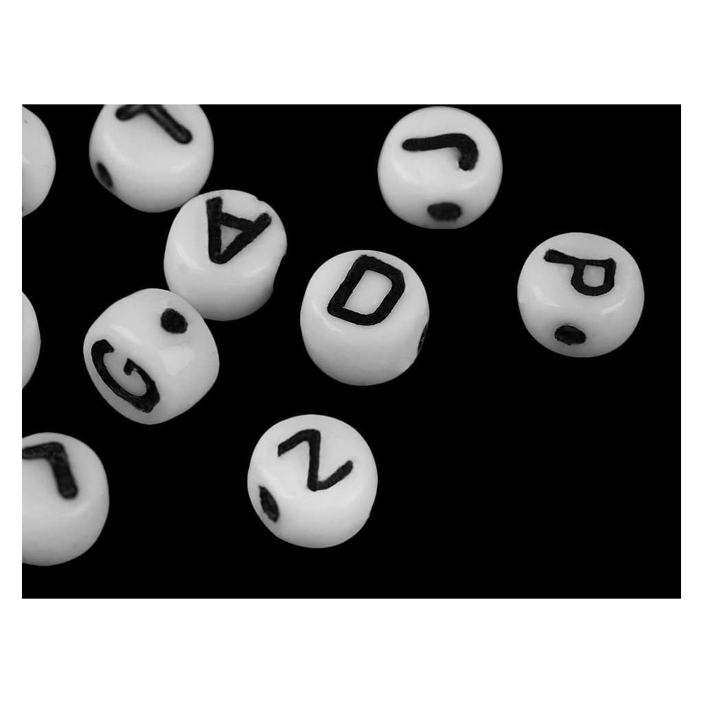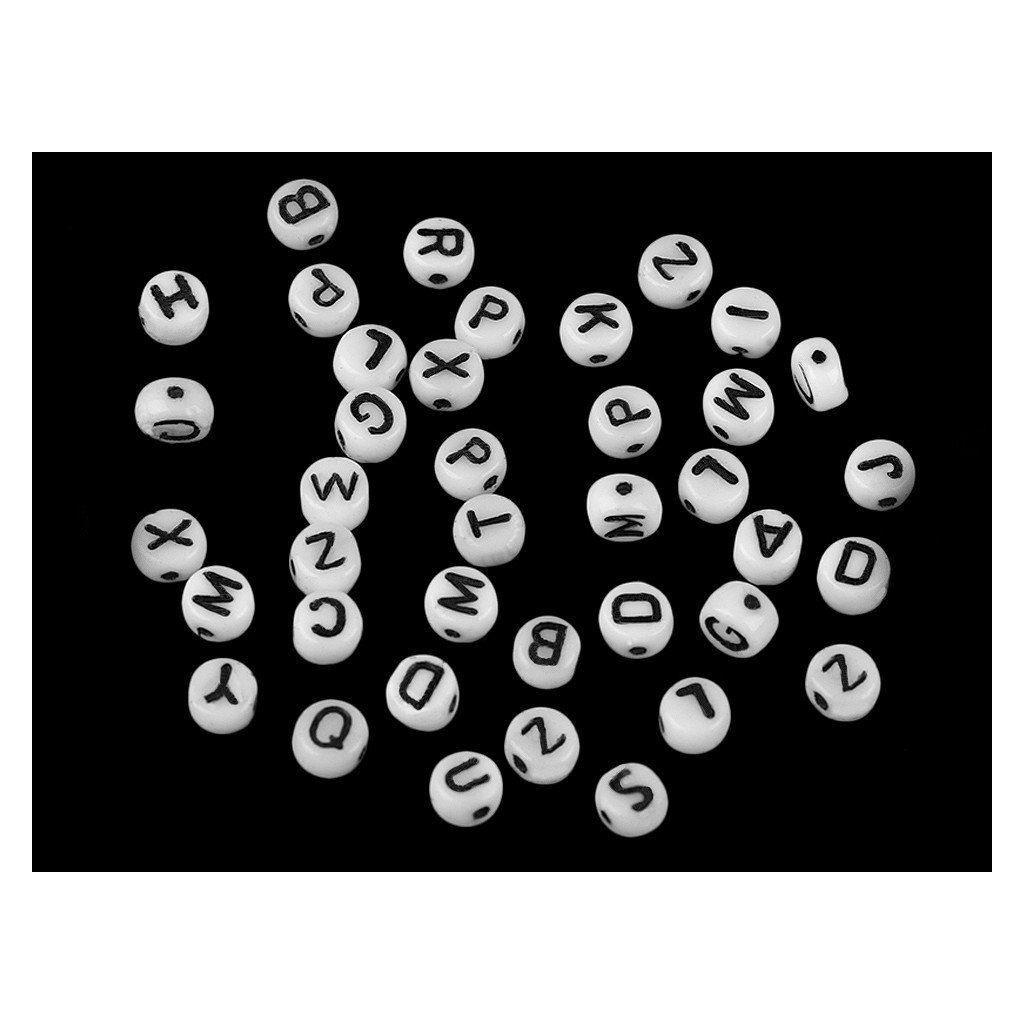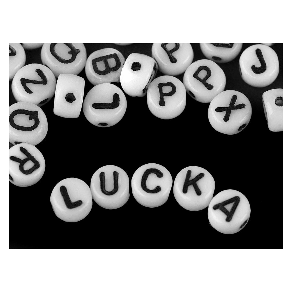 Korálky mají tvar kulaté placičky. Horizontálně umístěný průvlek umožňuje skládat z písmen slova, jména apod. Tělo korálku má bílou barvu, písmena jsou černá. Jako návlekový materiál můžete použít pruženky, silony apod.