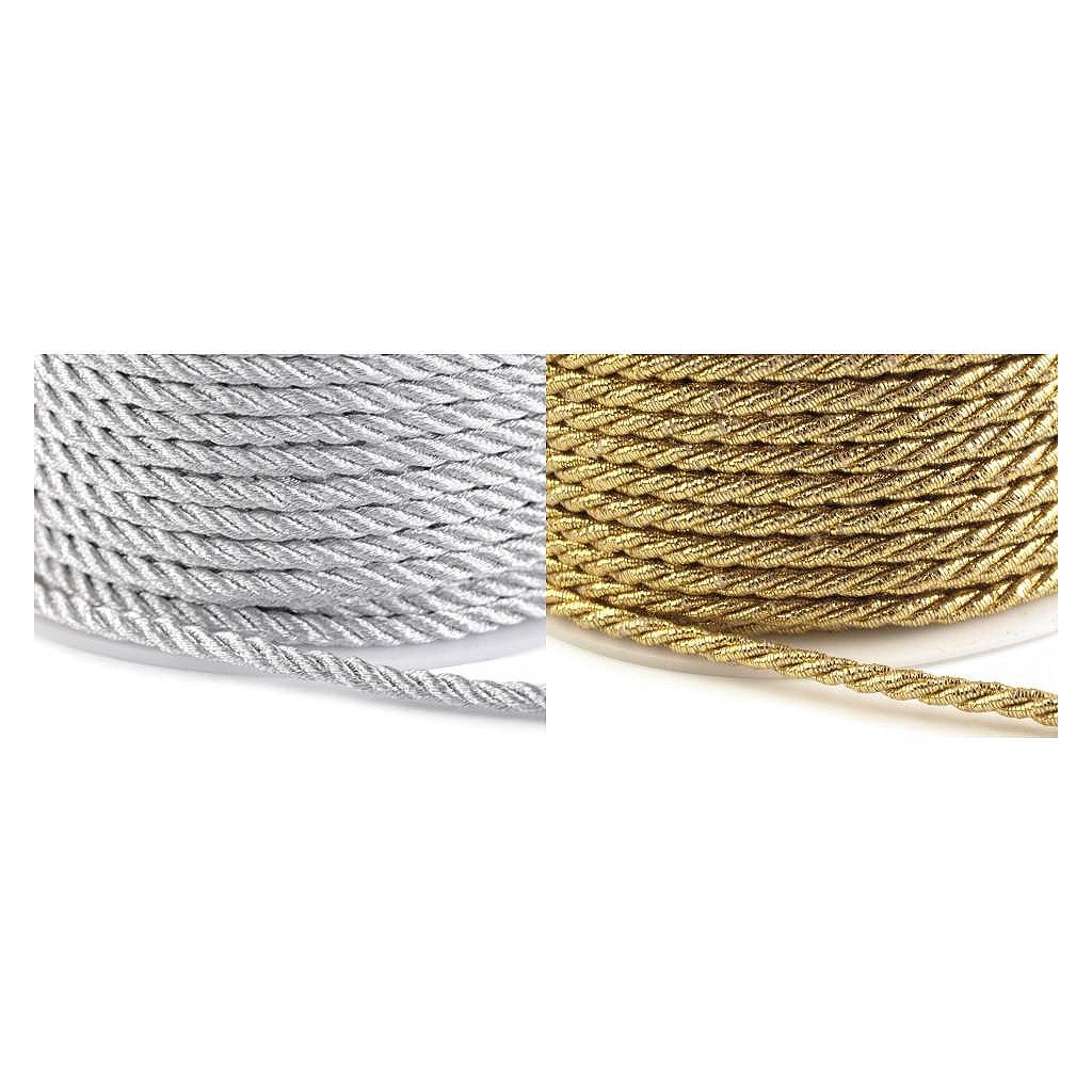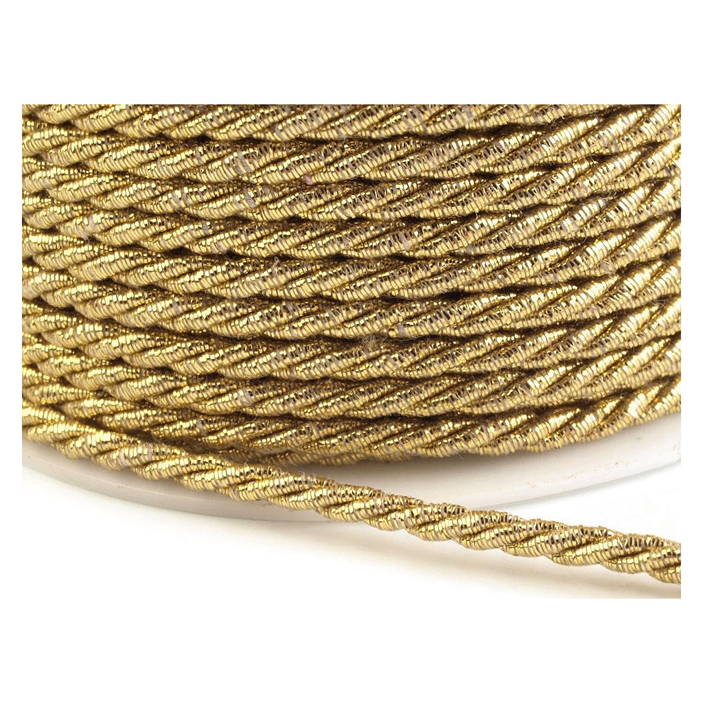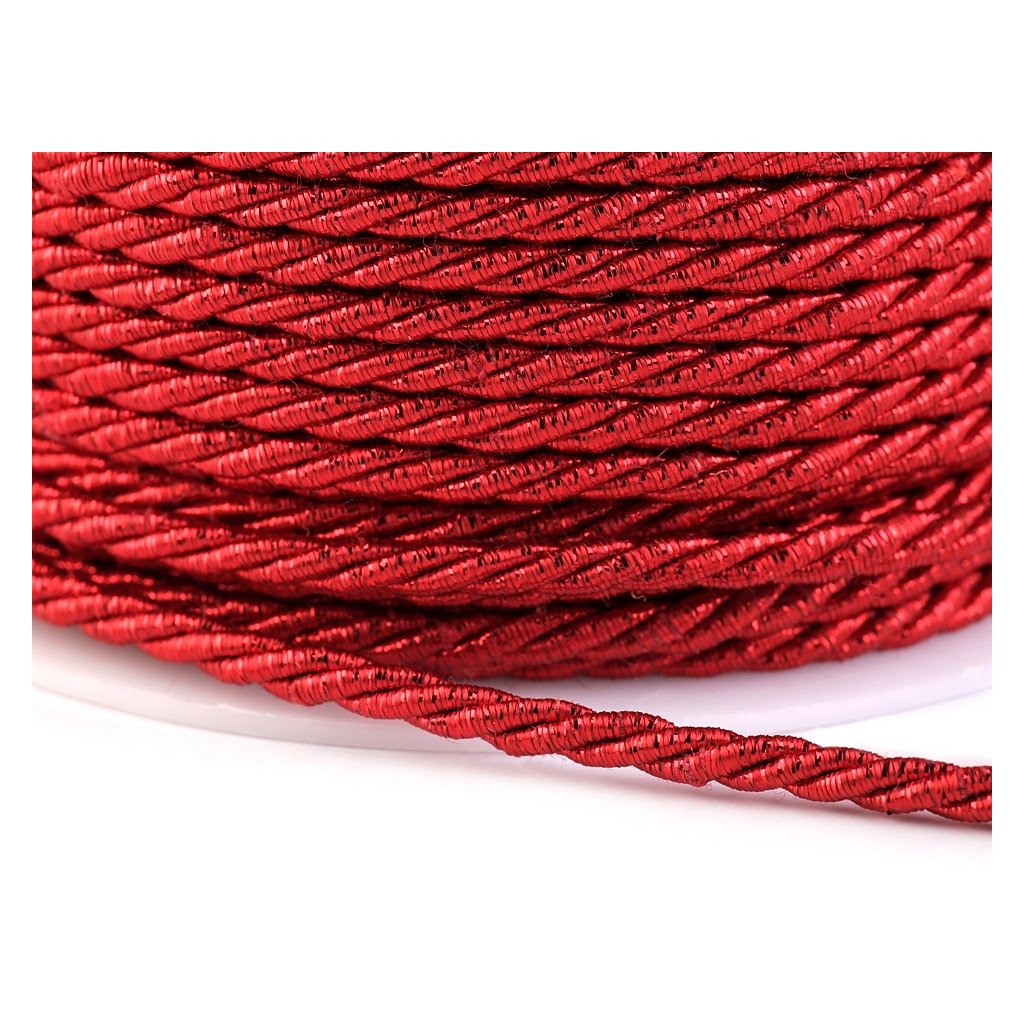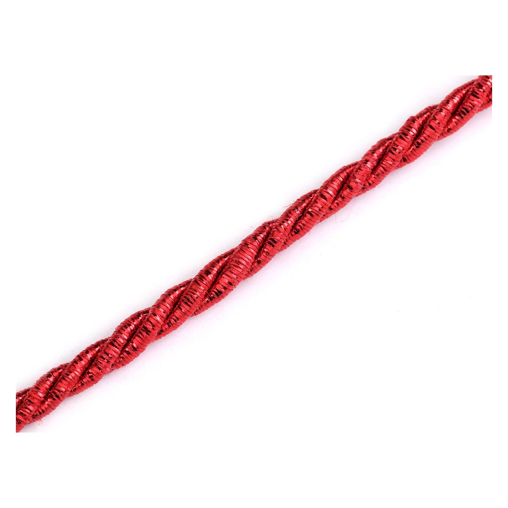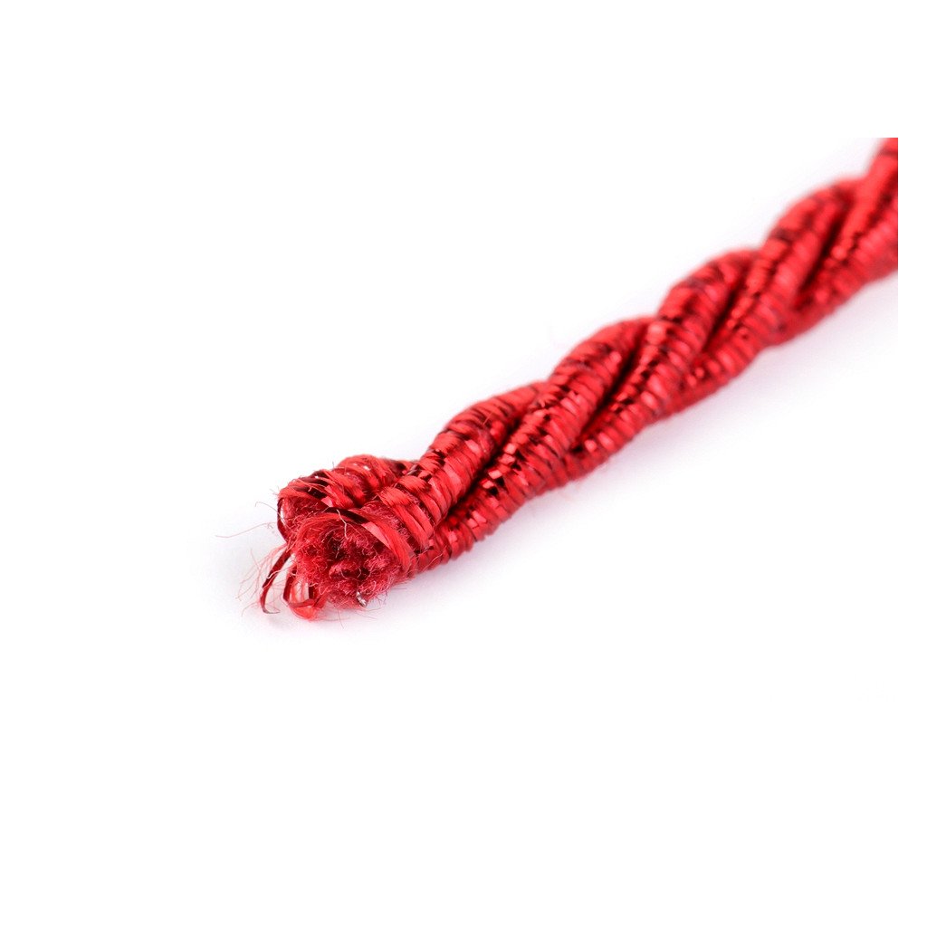 Kroucená šňůra s lurexem se efektně třpytí. Je složená ze tří tenčích provázků. Jednotlivé provázky mají bavlněné jádro opletené polyesterem a lurexem, který způsobuje zářivý třpyt.