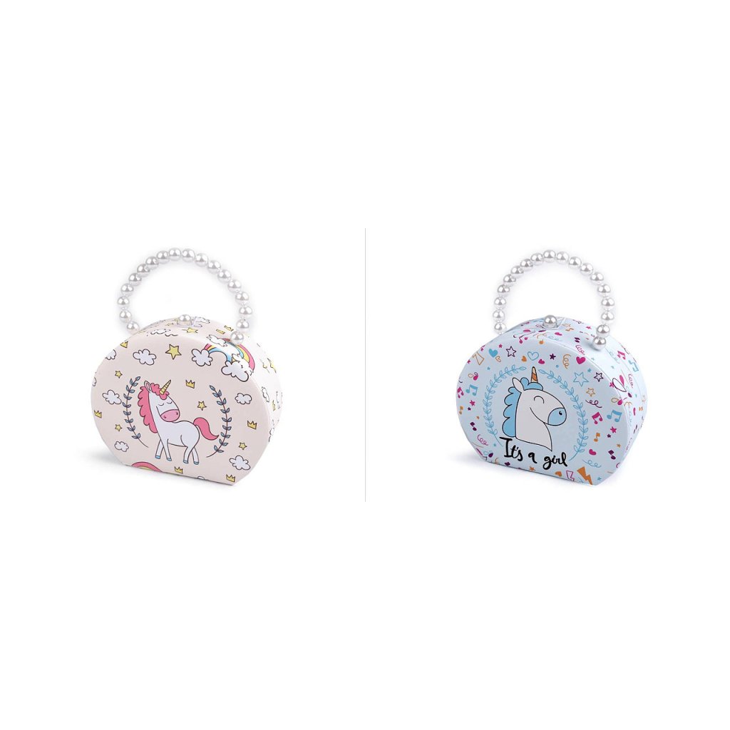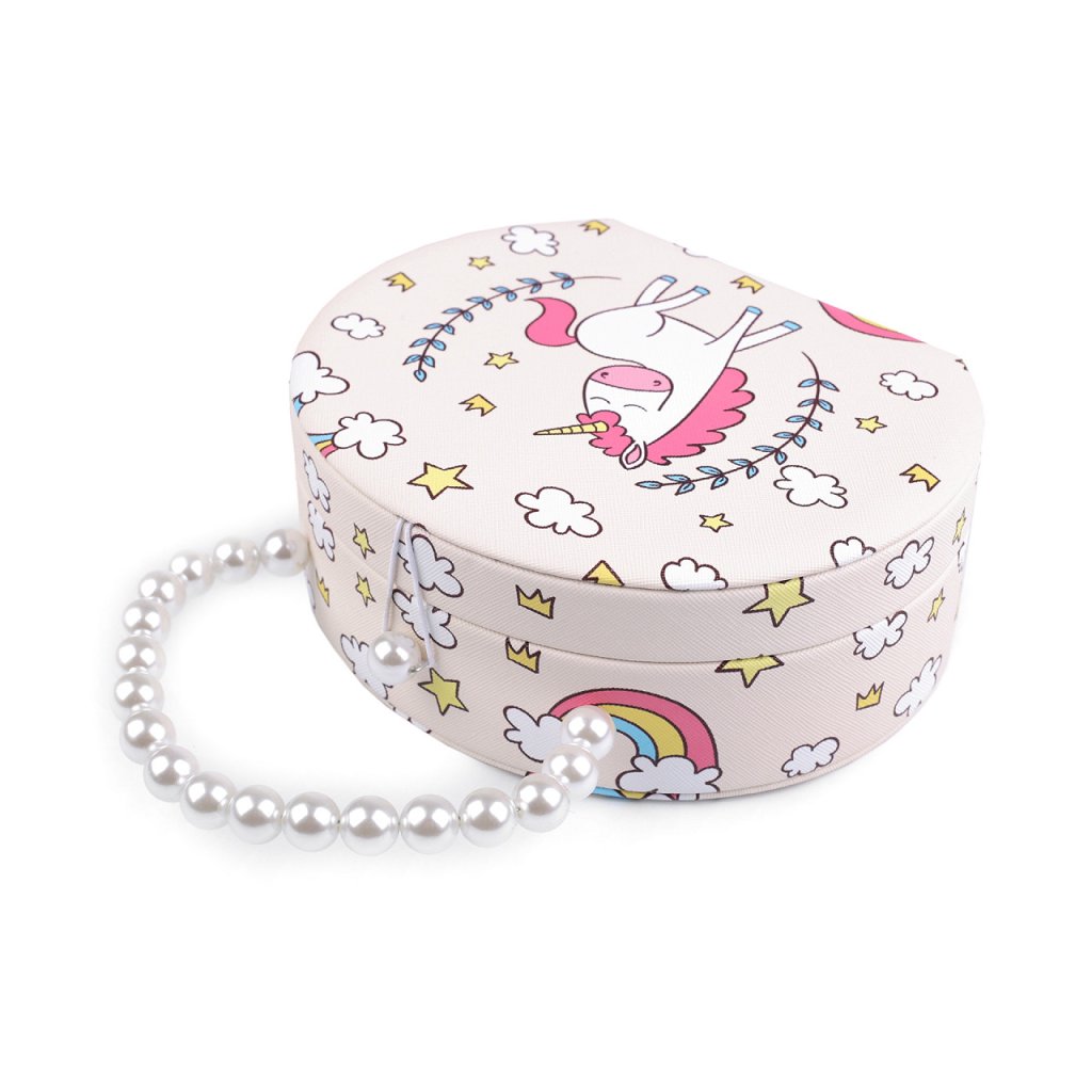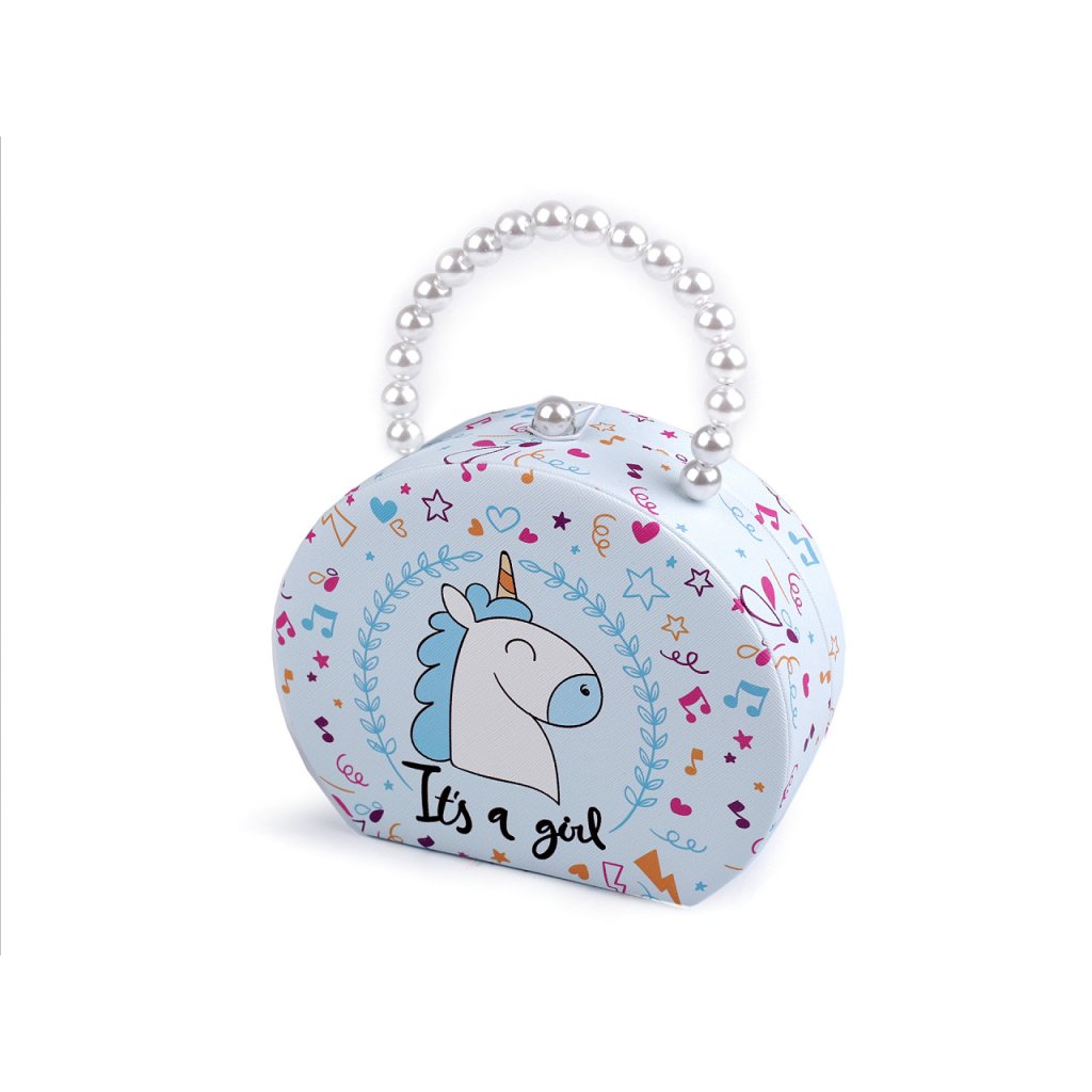 Šperkovnice ve tvaru kabelky s potiskem jednorožce má velice kvalitní a precizní provedení. Ochrání šperky před nepříznivými vlivy okolí, jako je světlo nebo vlhkost. Má perlové ucho k přenášení, zapíná se na perlu a pružné poutko. Uvnitř má 1 velkou a 2 malé přihrádky, oddíl na prsteny a zrcátko. Potisk je ze všech stran.