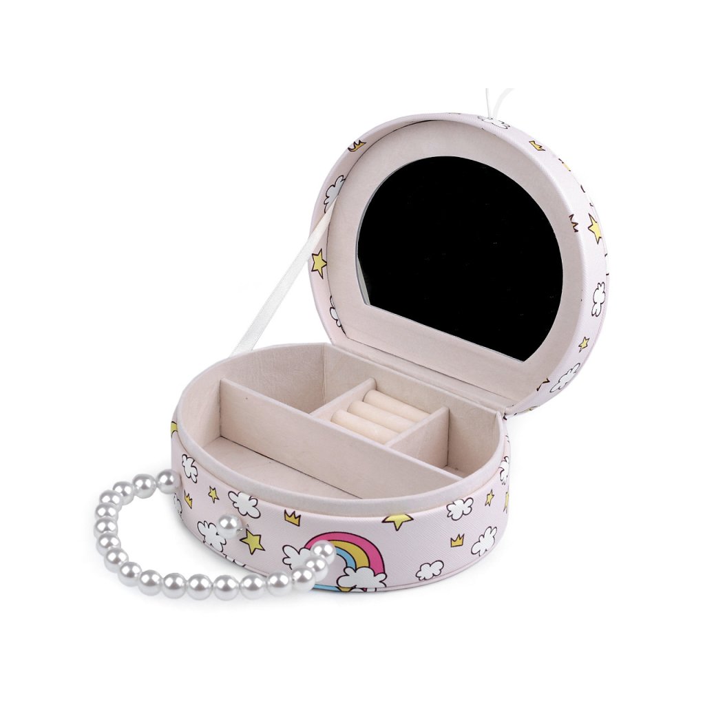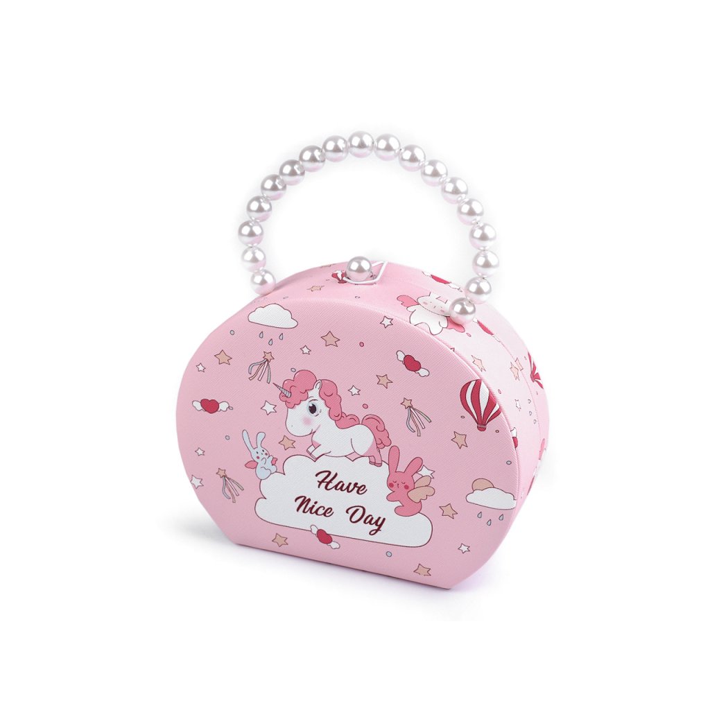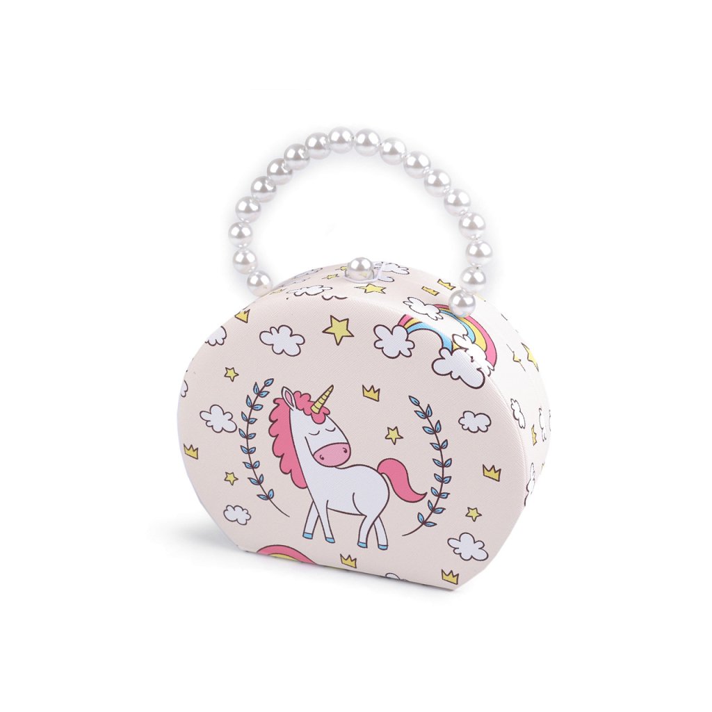 Šperkovnice ve tvaru kabelky s potiskem jednorožce má velice kvalitní a precizní provedení. Ochrání šperky před nepříznivými vlivy okolí, jako je světlo nebo vlhkost. Má perlové ucho k přenášení, zapíná se na perlu a pružné poutko. Uvnitř má 1 velkou a 2 malé přihrádky, oddíl na prsteny a zrcátko. Potisk je ze všech stran.