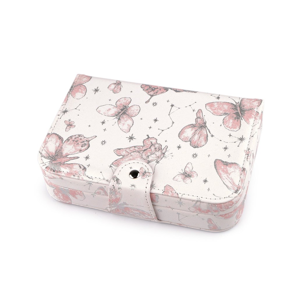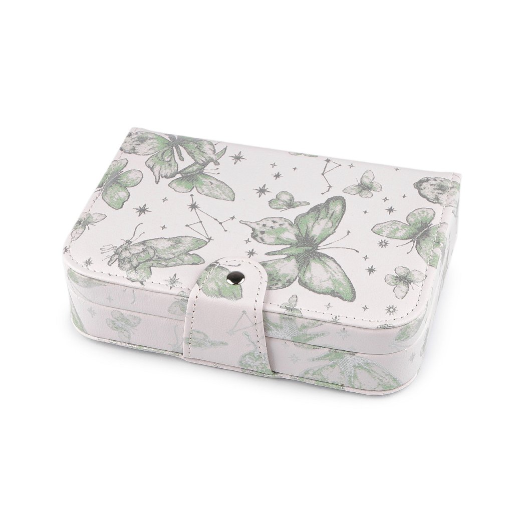 Šperkovnice se zrcátkem je vyrobená z kvalitní eko kůže. Ze všech stran má potisk s motýlů s metalickými odlesky. Zapíná se na přezku s patentem. Je přizpůsobená na postavení na výšku do knihovny. Spolehlivě ochrání šperky před nepříznivými vlivy okolí jako je světlo nebo vlhkost.