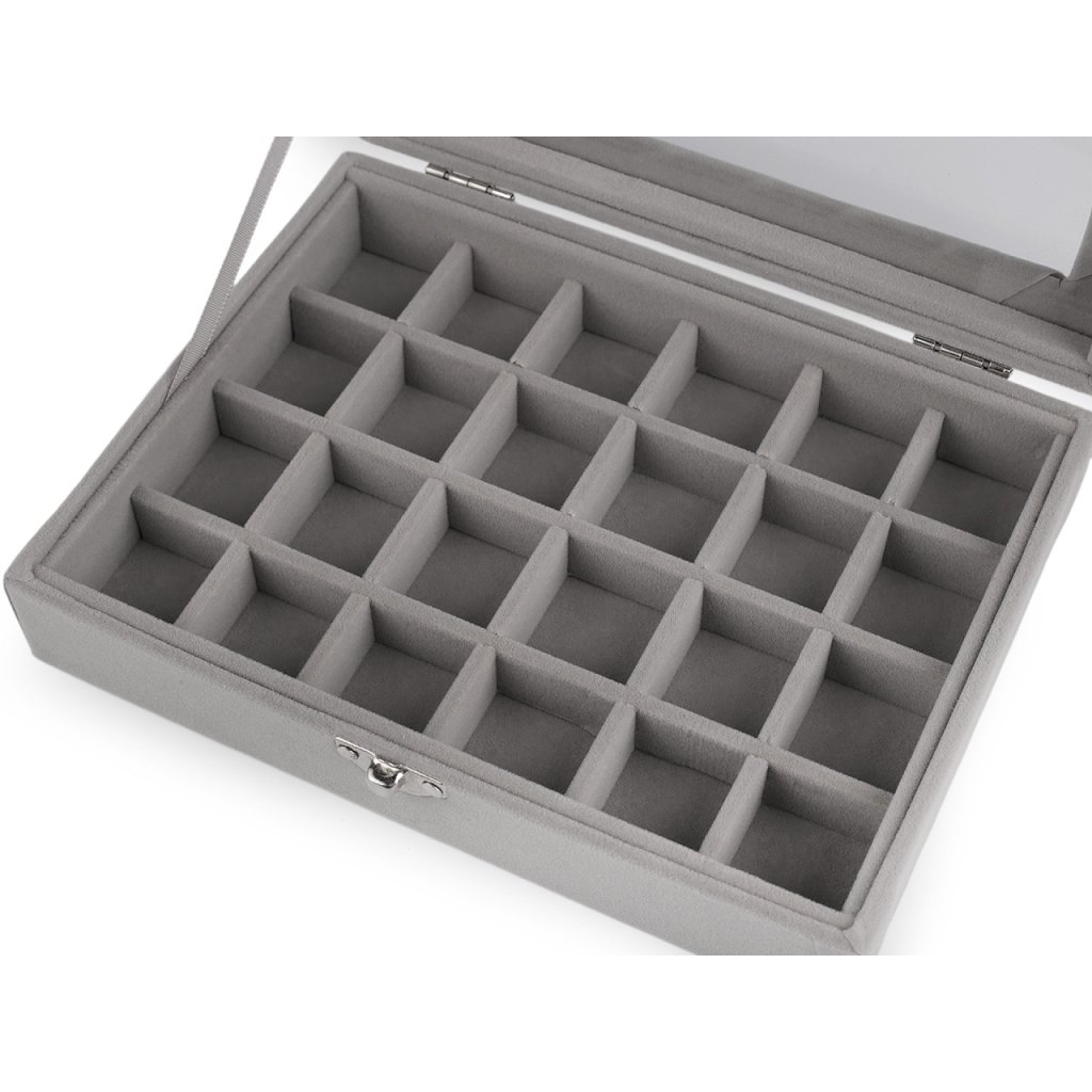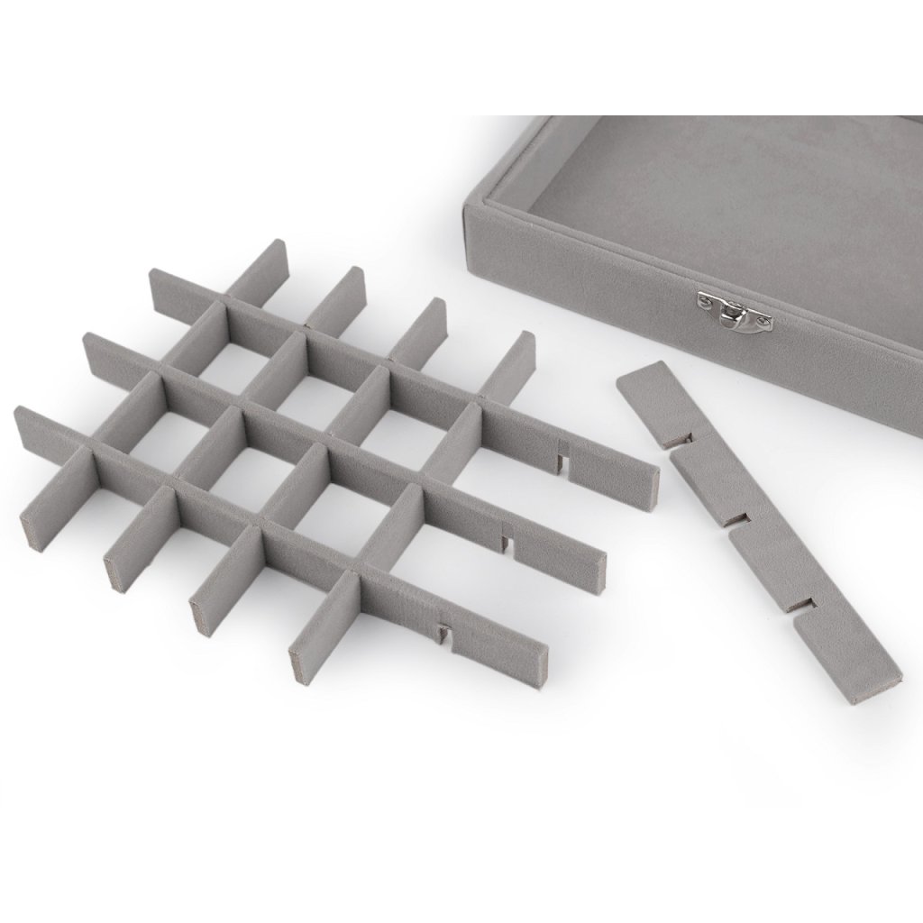 Vnitřní panel má přenastavitelné přepážky. Pokud používáte všechny najednou je ve šperkovnici 24 přihrádek o rozměrech 2,7 x 3 cm. Šperkovnice má velice kvalitní a precizní provedení.