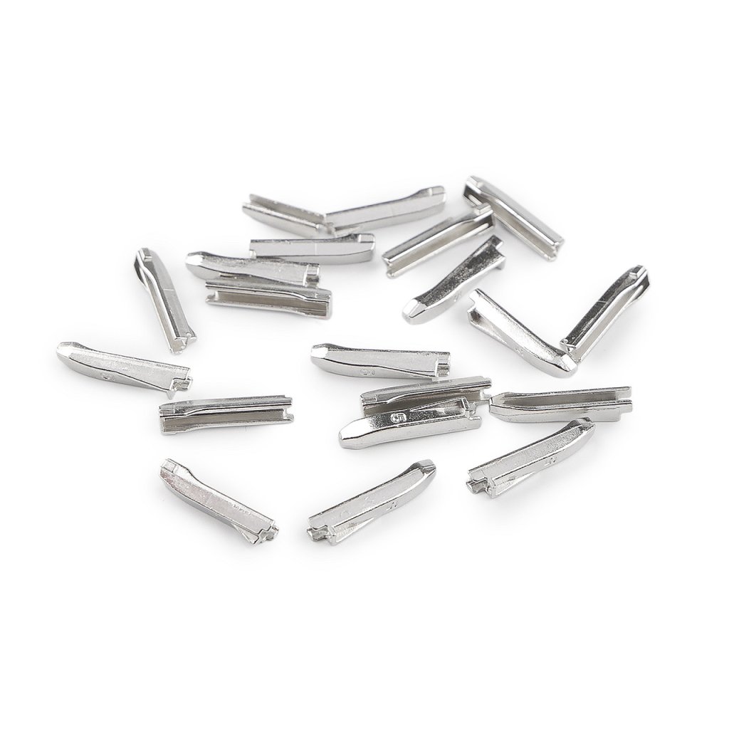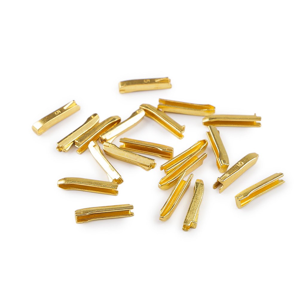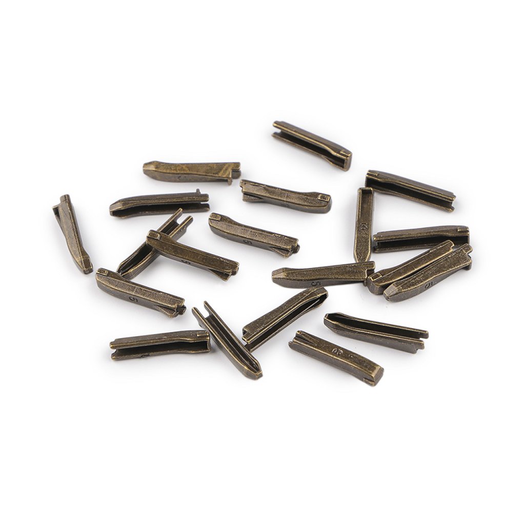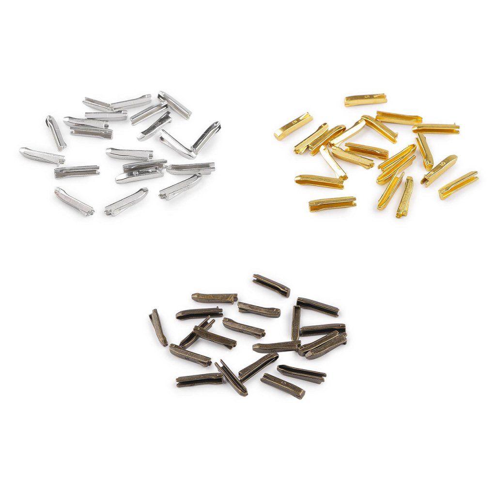 Kovové koncovky slouží k opravě kovového dvoucestného zipu No 5 (např. 580275). Sada se skládá ze dvou dílů. Aplikují se tak, že jednotlivé díly zasunete na tkanici na konci zipu a zastavíte se u zoubků, pak díly přimáčknete kleštěmi (vhodné jsou 090983 a 890990). Tkanici zipu doporučujeme před aplikací koncovek zpevnit vteřinovým lepidlem.