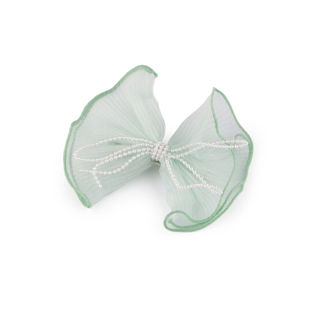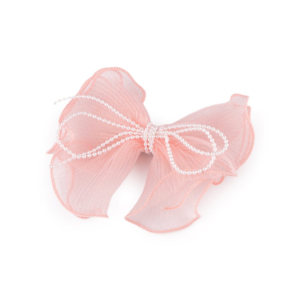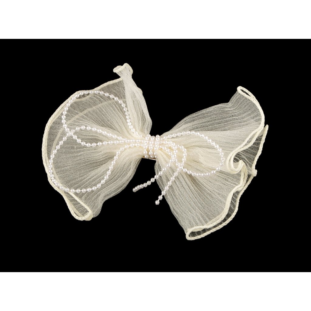 Velká spona s textilní mašlí nádherně ozdobí účes na všední den i slavnostní událost. Mašle je elegantní, ozdobená perlovým řetízkem. Je ušitá z vrapované monofilové stuhy s jemným třpytem, díky všitého silonu perfektně drží tvar. Spona má kvalitní celokovové provedení, ve vlasech pevně drží díky zoubkům.