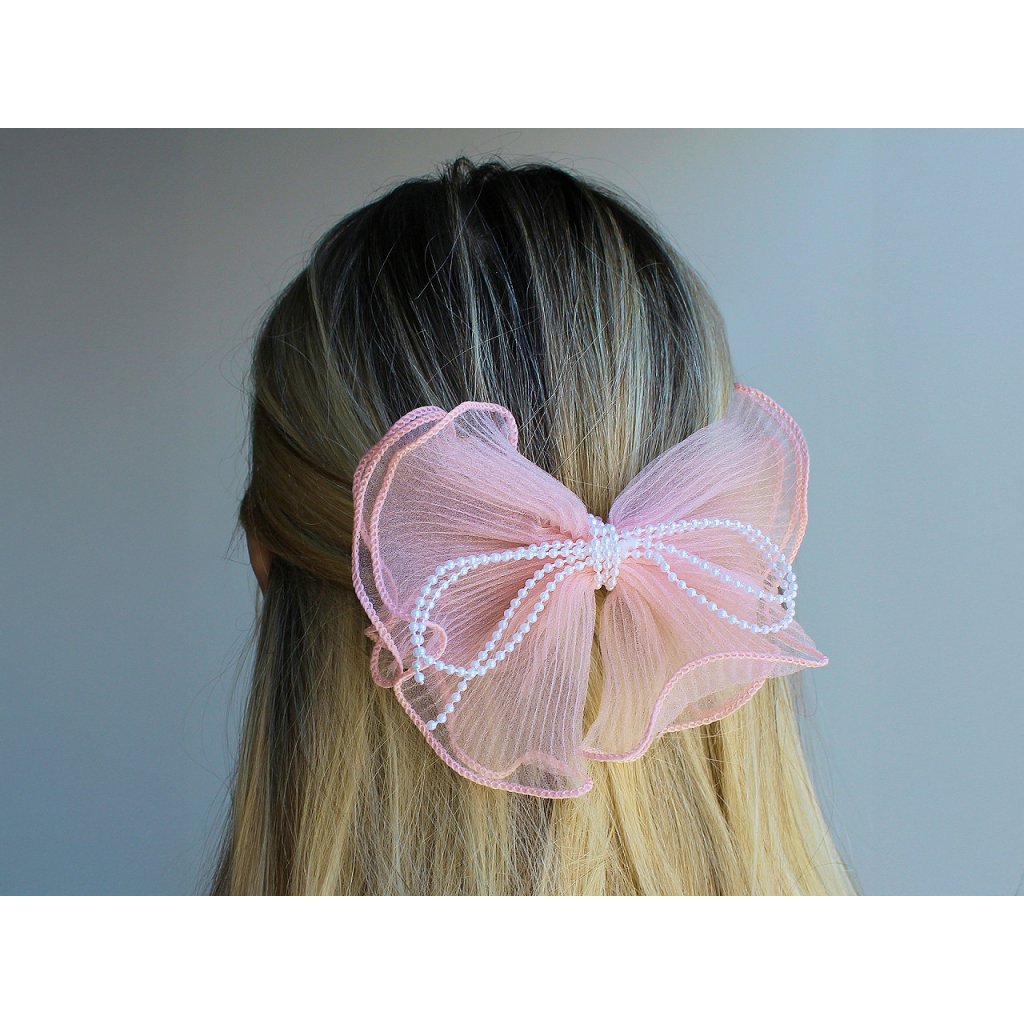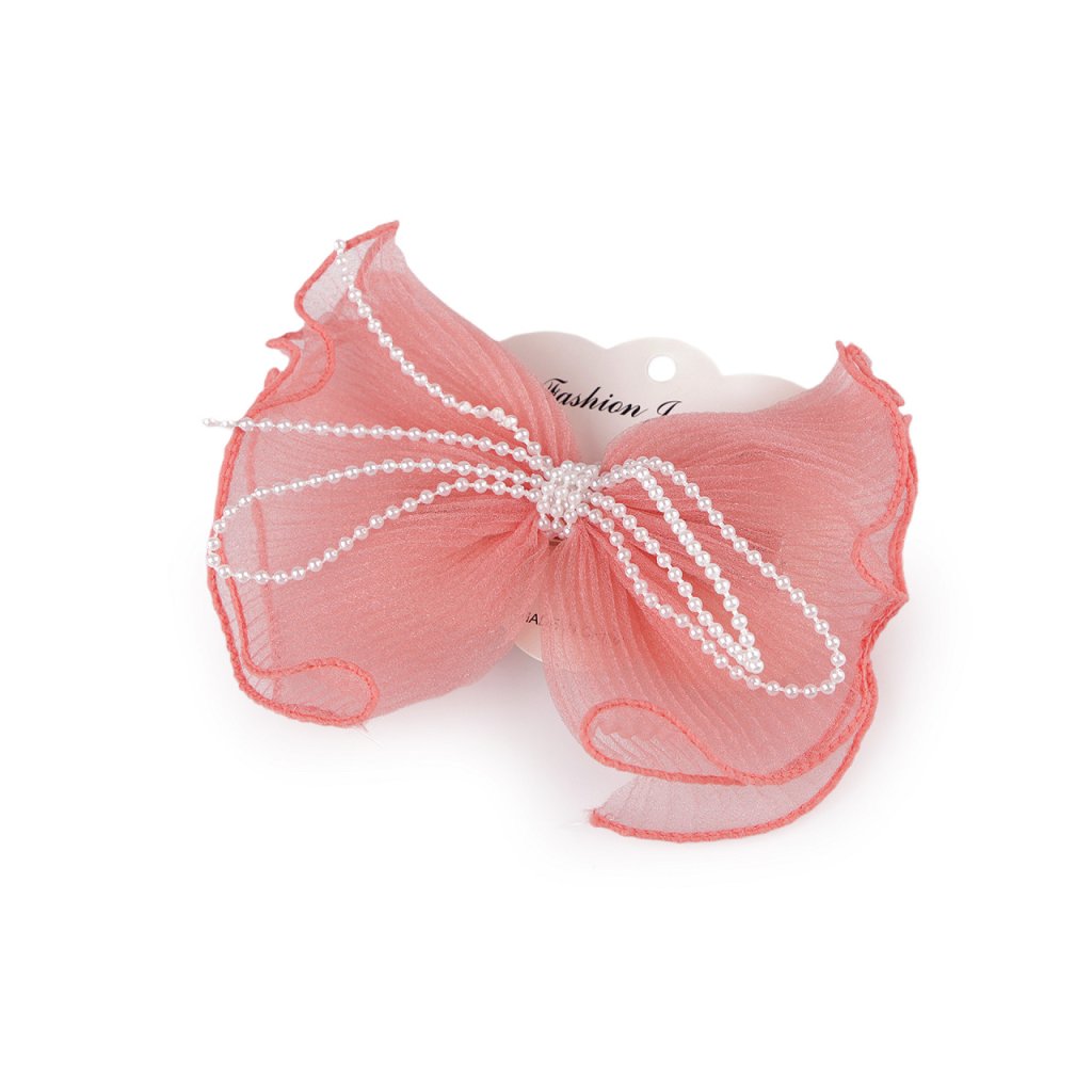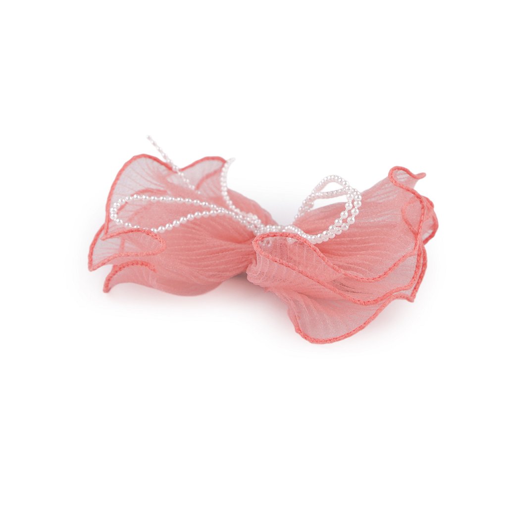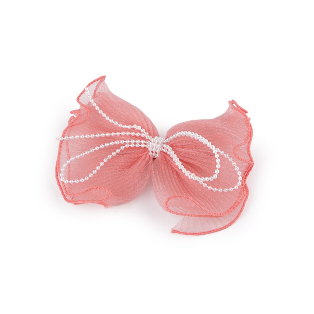 Velká spona s textilní mašlí nádherně ozdobí účes na všední den i slavnostní událost. Mašle je elegantní, ozdobená perlovým řetízkem. Je ušitá z vrapované monofilové stuhy s jemným třpytem, díky všitého silonu perfektně drží tvar. Spona má kvalitní celokovové provedení, ve vlasech pevně drží díky zoubkům.