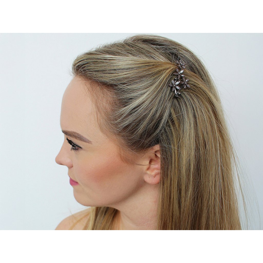 Elegantní sponku do vlasů zdobí květy s broušenými kamínky. Je vyrobená z kvalitního bižuterního kovu, na zadní straně má malé zoubky, ve vlasech dobře drží. Využijete ji na různé společenské akce, ale také na běžné nošení, zajímavě ozdobí váš účes.