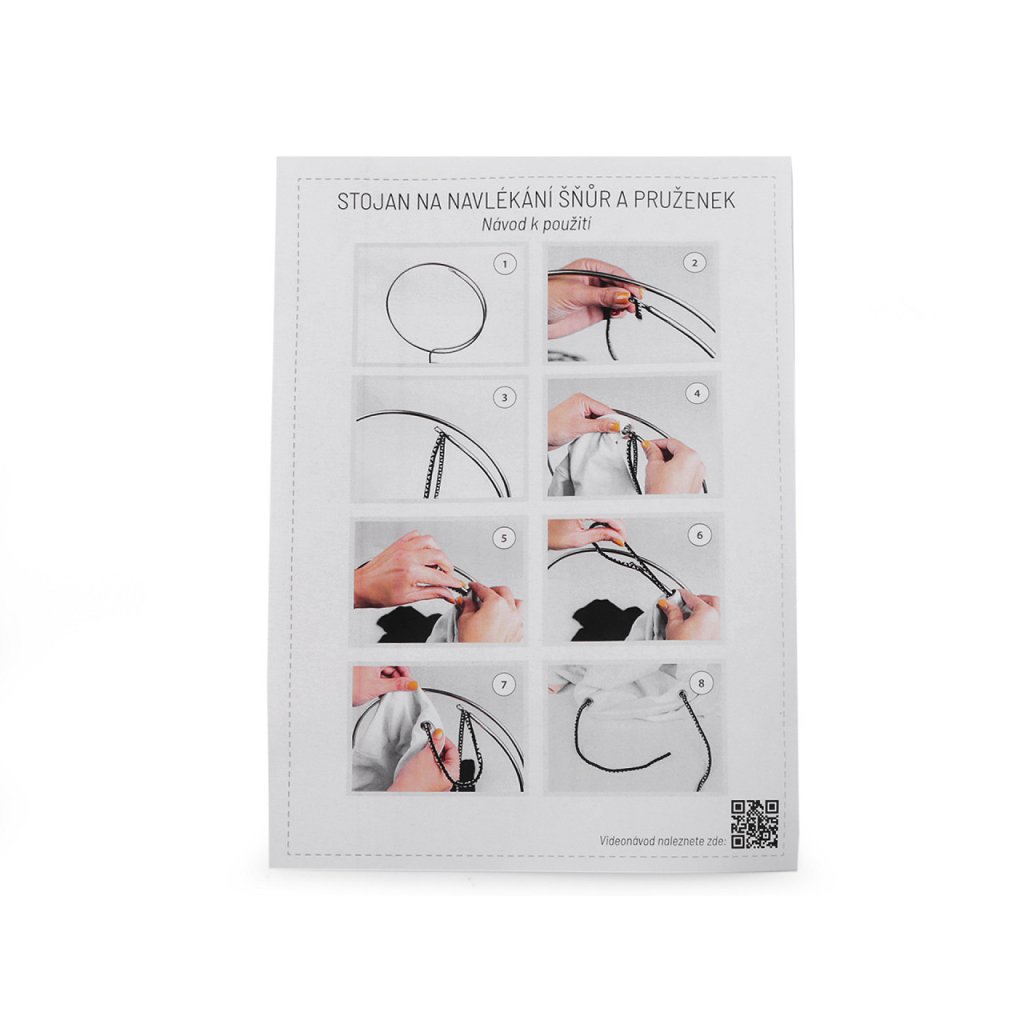 Bytelný kovový stojan je šikovným pomocníkem při navlékání šňůr a pruženek do vaků, kapucí mikin a bund. Na konci drátu je očko (4,8 x 16 mm) na provlečení šňůry či pruženky.