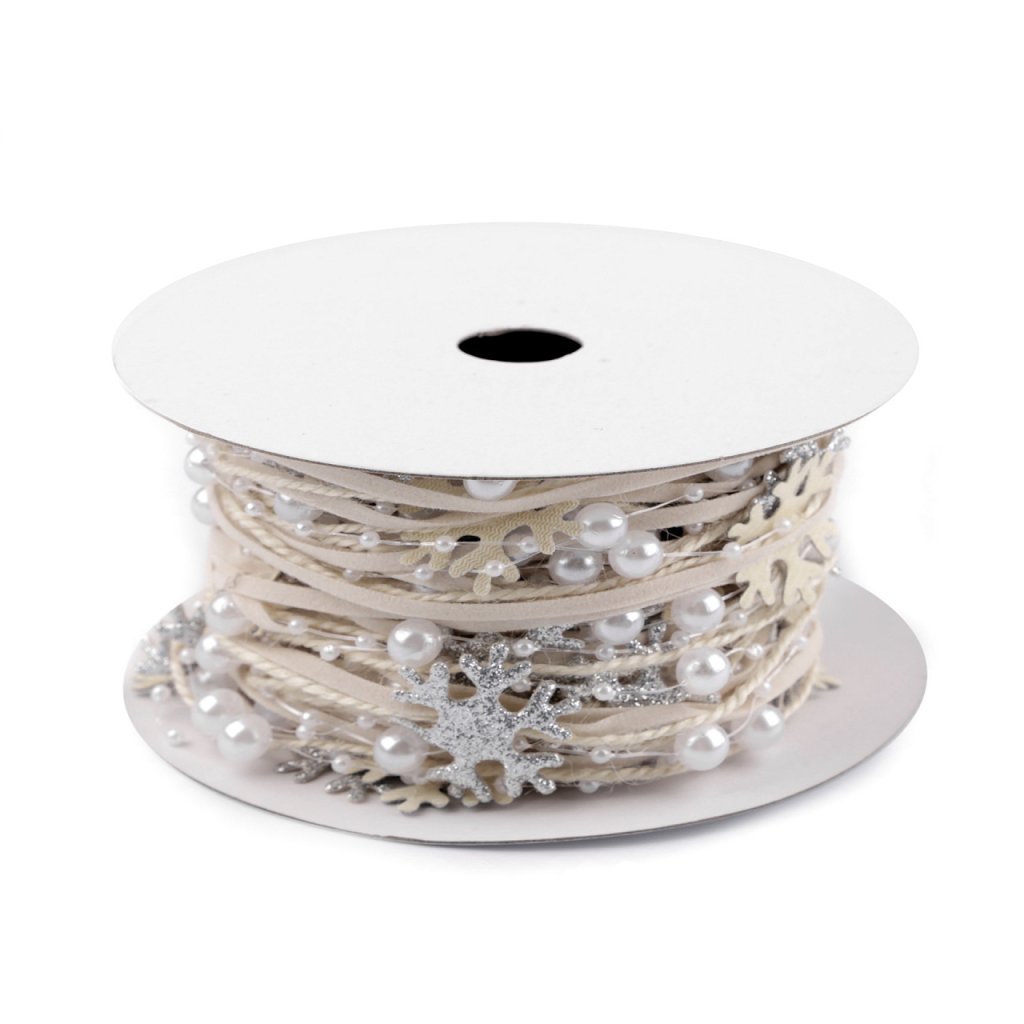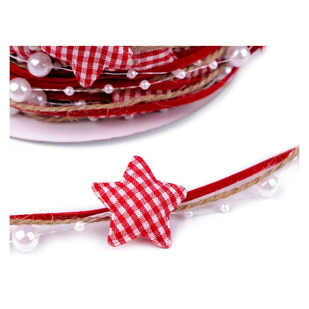 Trojitá vánoční stuha s hvězdami a perličkami je velice efektní. Je složená ze stužek z imitace kůže, juty a z perliček na silonu. Každých 21 cm jsou pomocí kárované hvězdy pevně spojené k sobě, aby pěkně držely pohromadě. Hvězda je na dotek měkká.