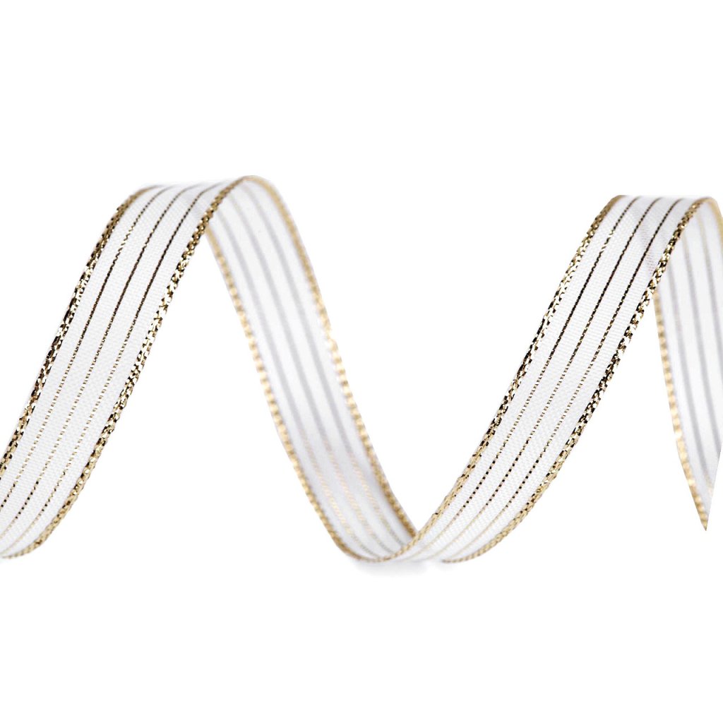 Třpytivou dekorační stuhu zdobí proužky z lurexu. Je pevná, oboustranná, uvázané mašle drží pěkně tvar.