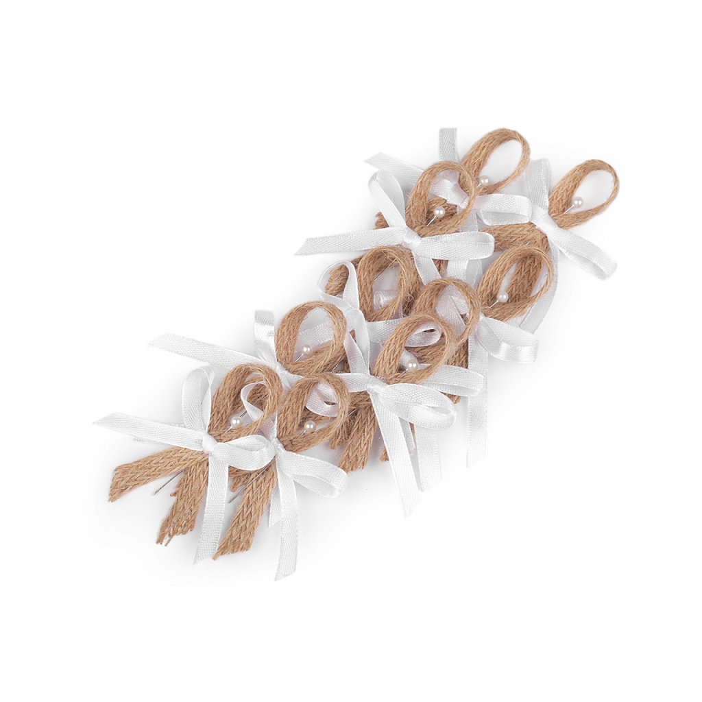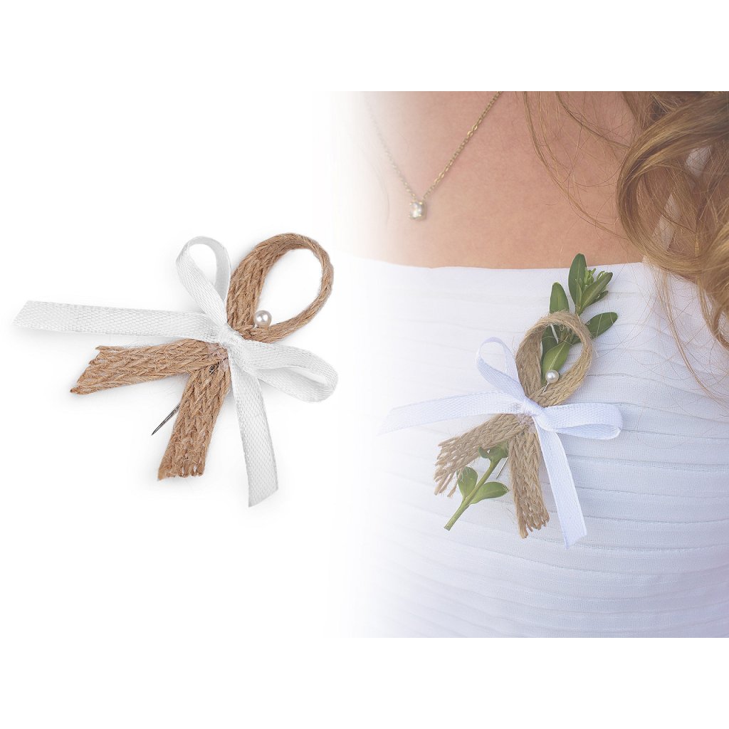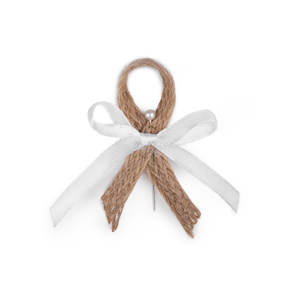 Svatební jutové mašličky v boho stylu jsou velice populární. Slouží především k ozdobení klopy ženicha a svatebčanů. Jsou kvalitní, ručně zpracované. Skládají se z jutové stuhy, saténové mašle a perleťového špendlíku. Mašličky můžete použít také k aranžování různých svatebních dekorací.