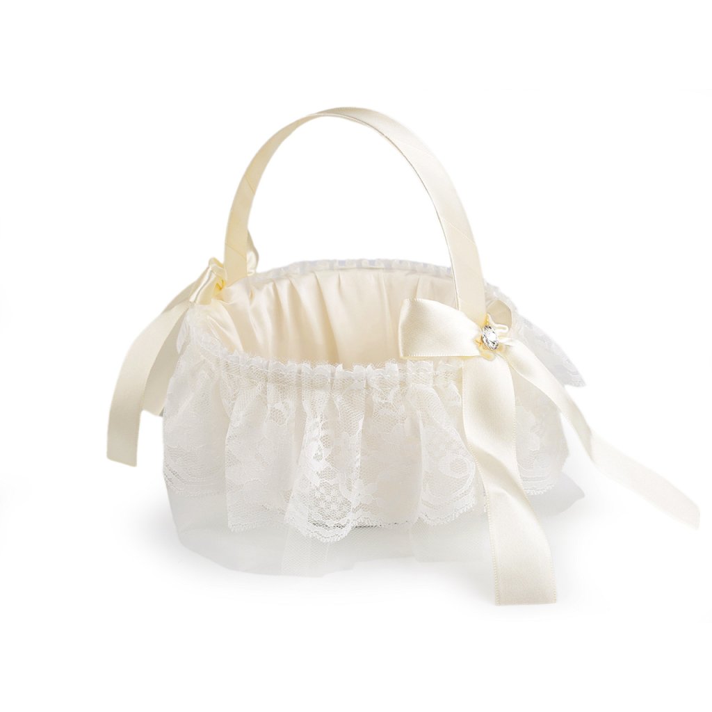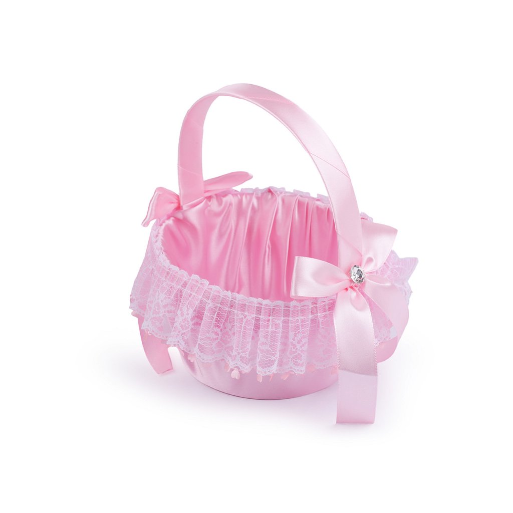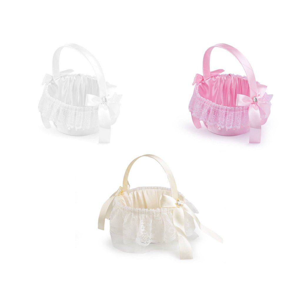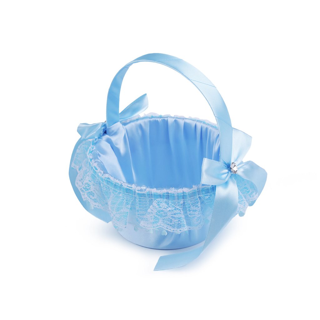 Saténový svatební košíček je jako třešnička na dortu pro všechny družičky. Uvnitř se budou vyjímat plátky růží nebo květinová aranžmá. Košíček je vyrobený z pevnějšího plastu. Zdobí ho mašličky ze saténové stuhy, broušené kamínky a krajka.