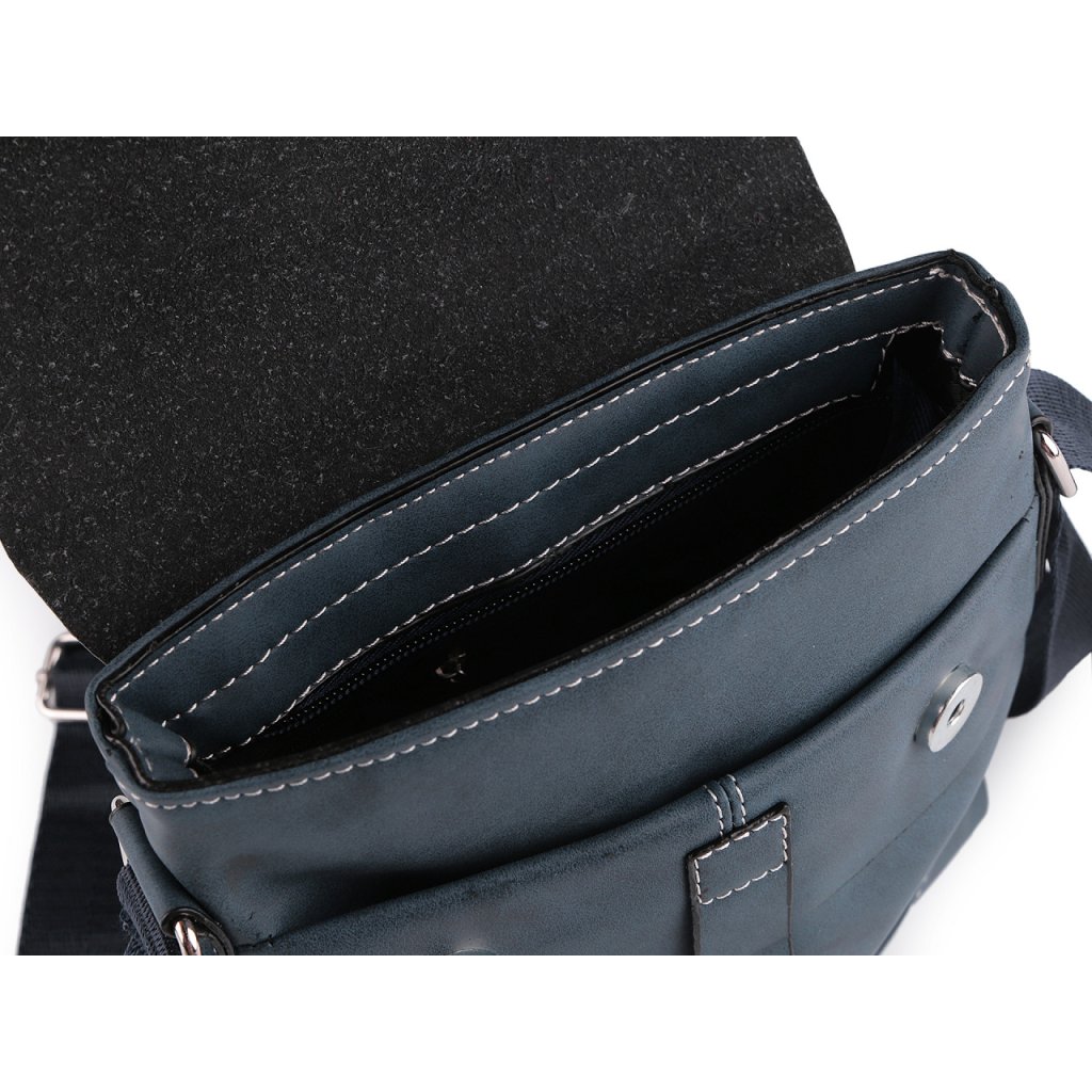Menší crossbody taška je stylovým doplňkem nejen pro muže, je oblíbená i ženami. Díky syntetického materiálu, který vypadá jako kůže, má taška punc kvality i vkusné originality. Je ozdobená falešnou přezkou s kovovým detailem a výrazným štepováním.