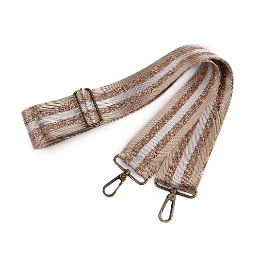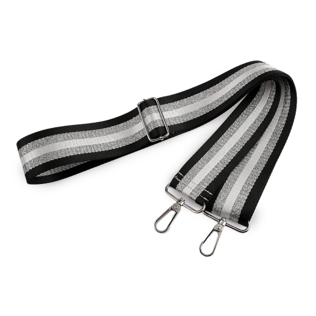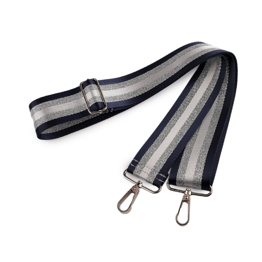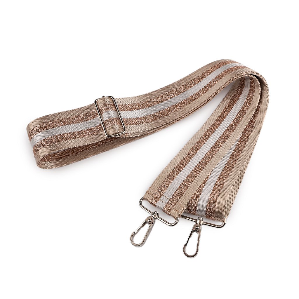 Textilní popruh vyniká lurexovými pruhy, které se poutavě třpytí. Je oboustranný. Na každé straně má kovovou karabinu, takže ho ke kabelce či tašce lehce připnete. Délku můžete regulovat.