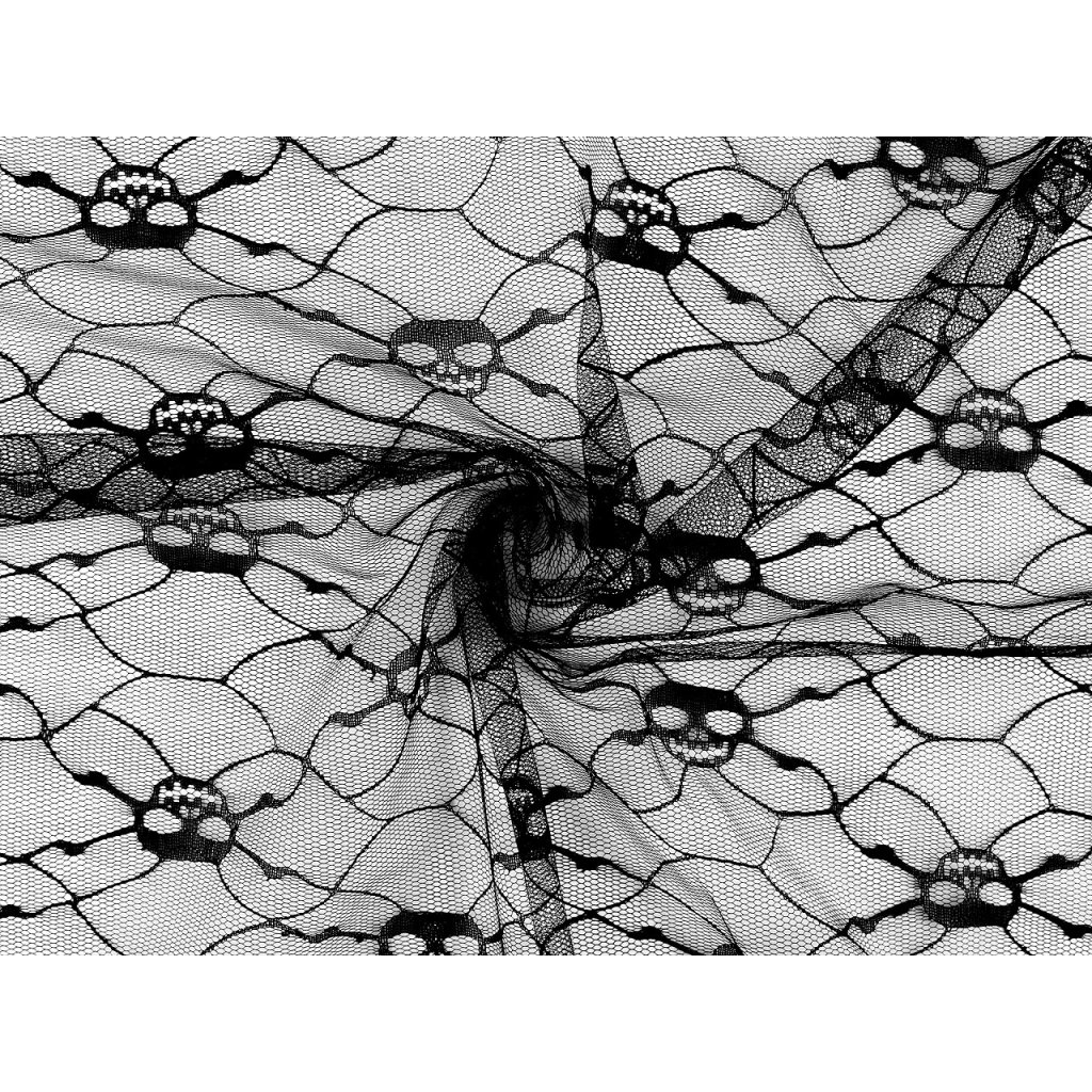 Jemný splývavý tyl se svým designem hodí na halloweenské kostýmy a strašidelné aranžování. Najdete na něm motivy lebek.