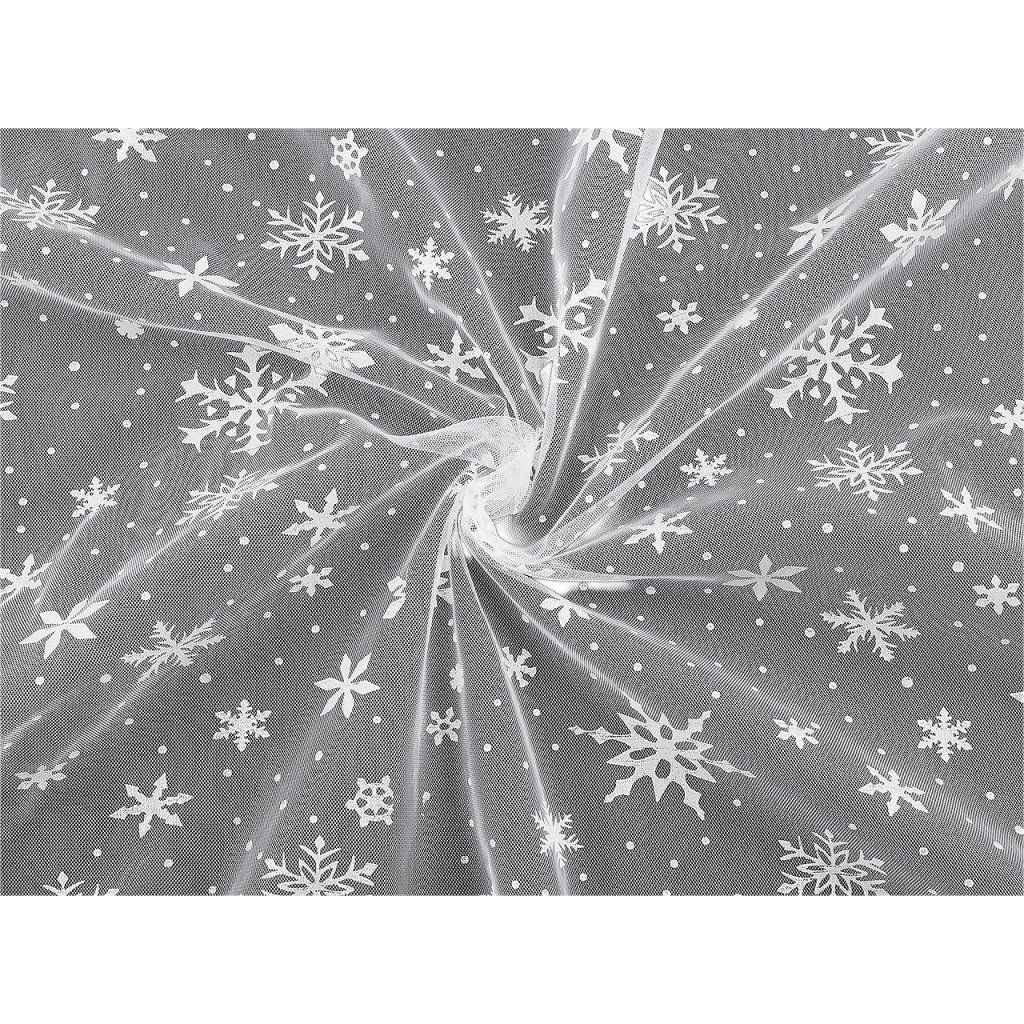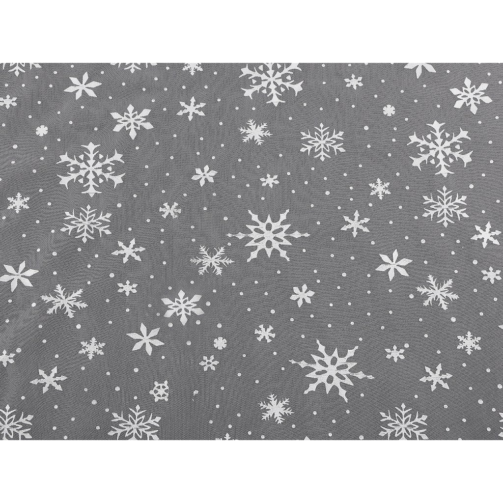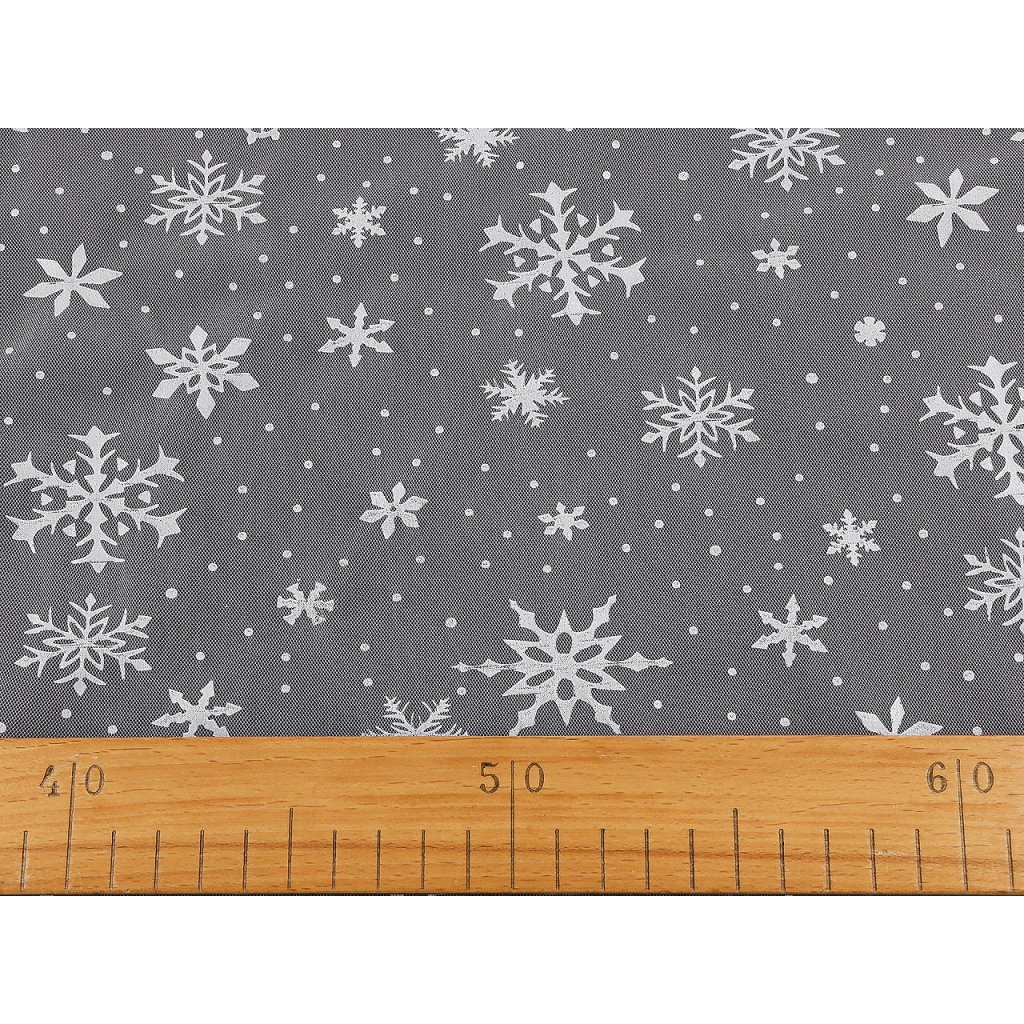 Vánoční tyl zdobí potisk sněhových vloček. Je jemný, měkký a pruží více po šíři. Využijete ho na šití závojů, sukýnek, karnevalových kostýmů i různých dekorací a zimních aranžmá.