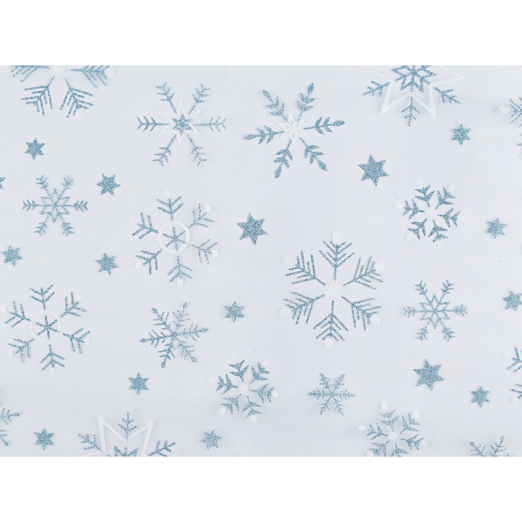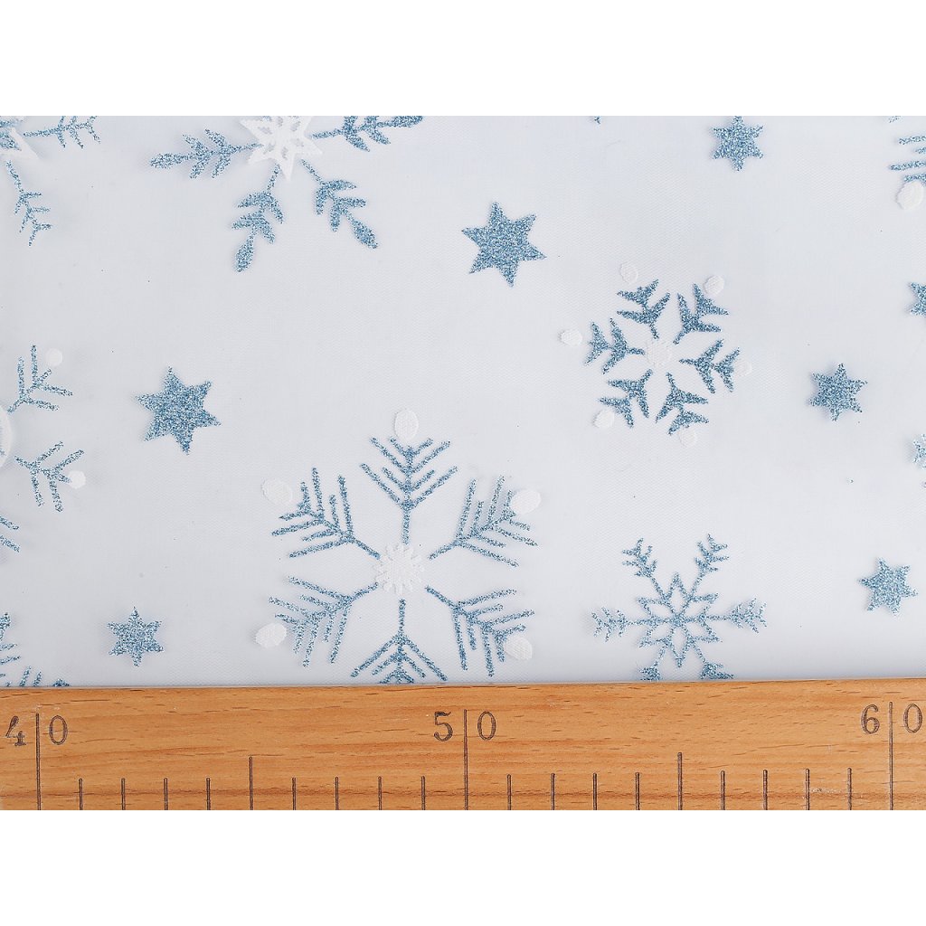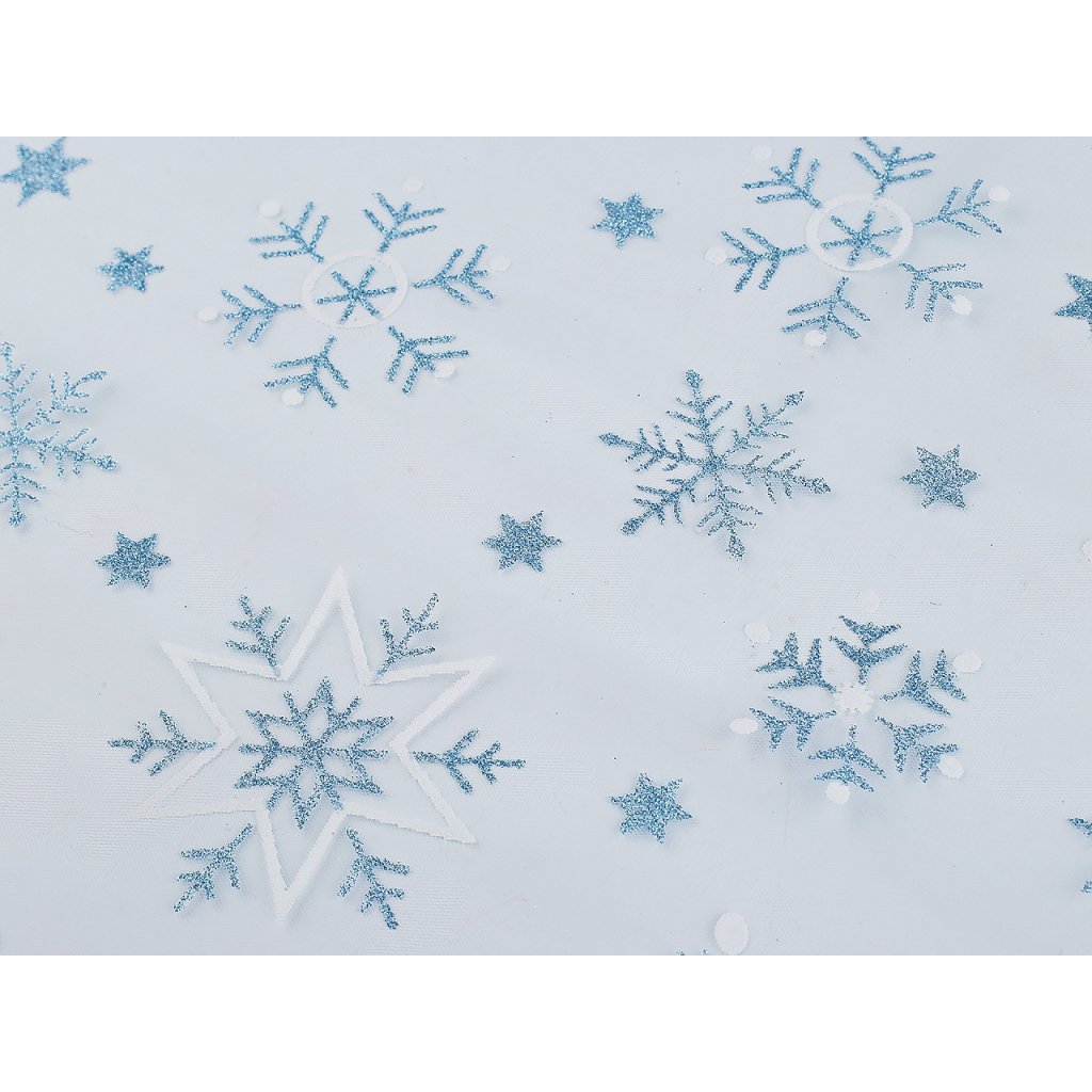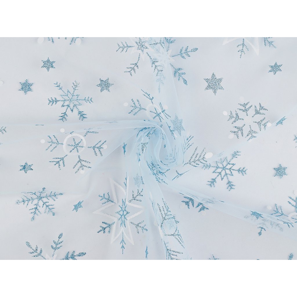 Vánoční tyl s potiskem vloček je jemný, měkký a pružný. Využijete ho na šití sukýnek, karnevalových kostýmů i různých dekorací a zimních aranžmá. Díky glitrům se efektně třpytí.
